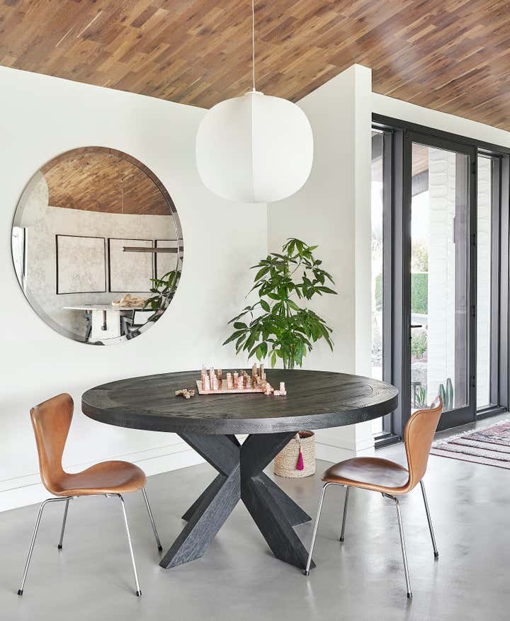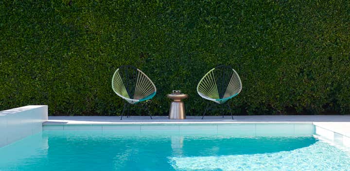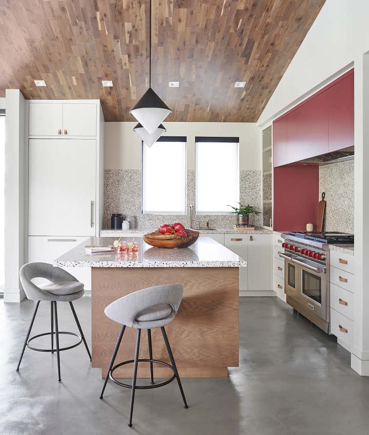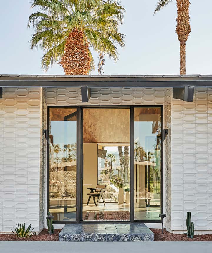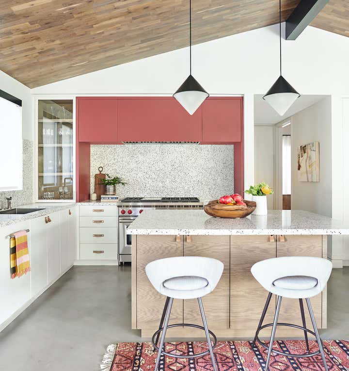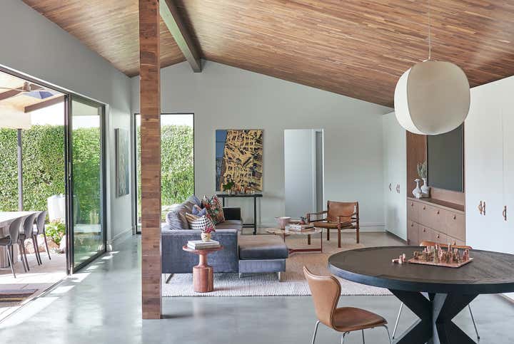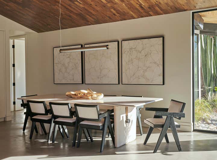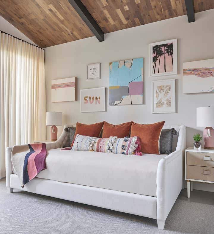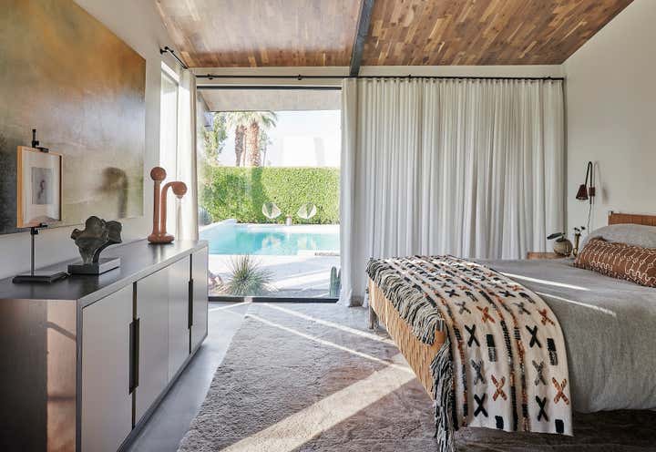 Merging modernism and California cool was the intent behind this second home to longtime Bishop Studio clients looking for a desert retreat. With rich wood planks covering the ceiling, a soft white palette was introduced for levity in the main living spaces, while vibrant hues offered playful accents throughout.