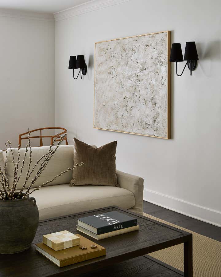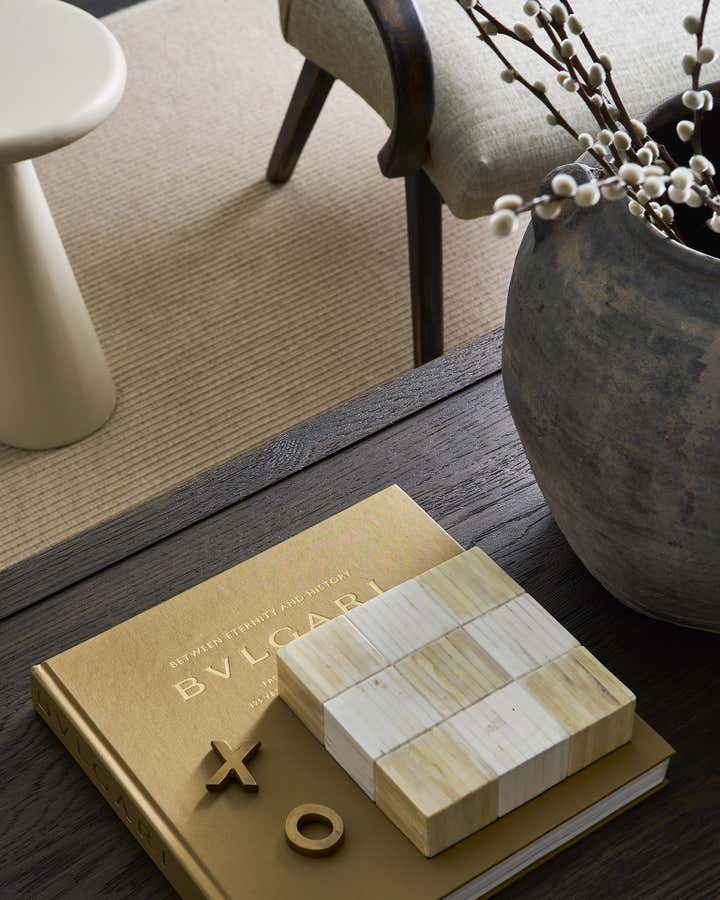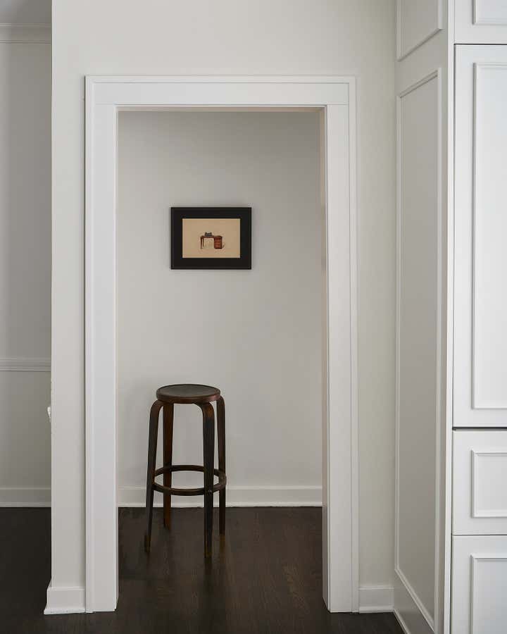 The remodel focused on the design of a new kitchen featuring fully integrated appliances, minimal hardware, and exquisite, white, floor-to-ceiling cabinetry make the kitchen a moment to remember. The experience continues with unexpected details, including a gourmet espresso bar and a beautifully patinaed range hood and backsplash.