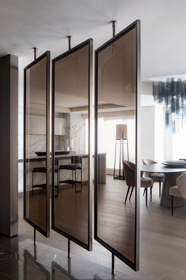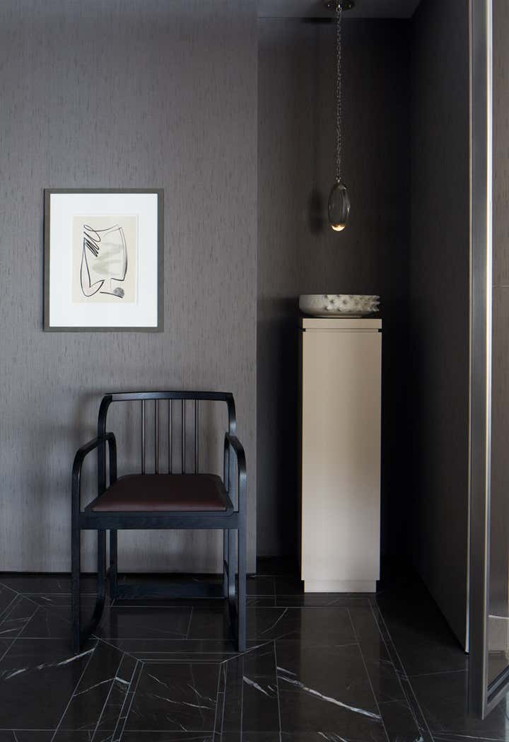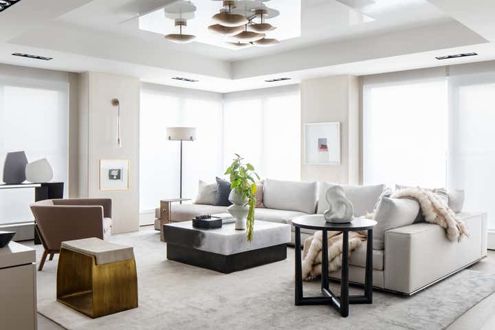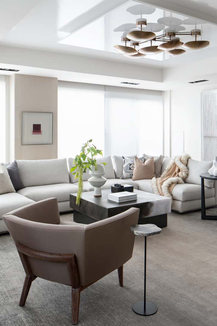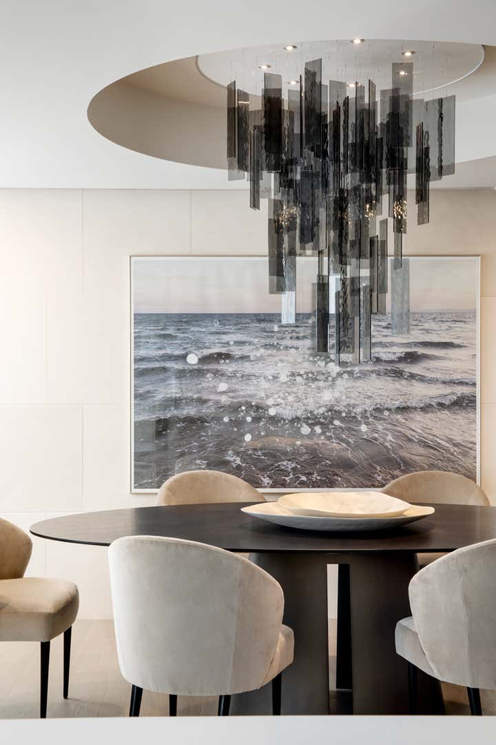 Calm, sophisticated and luxurious describe this spacious lakeside Penthouse overlooking Toronto’s expansive skyline on the shores of Lake Ontario. It was a wonderful opportunity to reinvent a 3,500 square foot residence for a well-traveled business woman. Our brief was simple: create a ‘hotel-like’ residence flexible to host large parties, while maintaining the intimacy of a private home. Demolishing a warren of angled partition walls to bare concrete slabs revealed a shell waiting to be transformed into a light-filled home. Our goal was to define the interior architecture and design a floor plan that divided the space into two separate zones, one public and one private. It was important to create a beautiful Foyer that introduced the design vision and visually felt connected to the open living area. A custom installation of three pivoting metal and tinted glass screens define the area without closing it off. A neutral colour story, quiet natural finishes, and understated silhouettes were incorporated to showcase the overall experience of viewing the spectacular vistas. A structural wall clad in pale limestone separates the Living Room from the Dining Area and Kitchen, while still keeping the flow of space open for entertaining large groups of friends and family. Original art and artisanal pieces were carefully curated for their beauty and easy elegance. A well-appointed private Master Bedroom Suite at the opposite end of the Penthouse, consists of a large Bedroom, comfortable Den, serene Bathroom and a spacious Closet all connected by a lovely Entry Hall that can be easily closed off with a set of custom pocket doors. Large expansions of glass bring in abundant natural light to accentuate the pure lines of the understated architecture creating a vision of contemporary luxury.