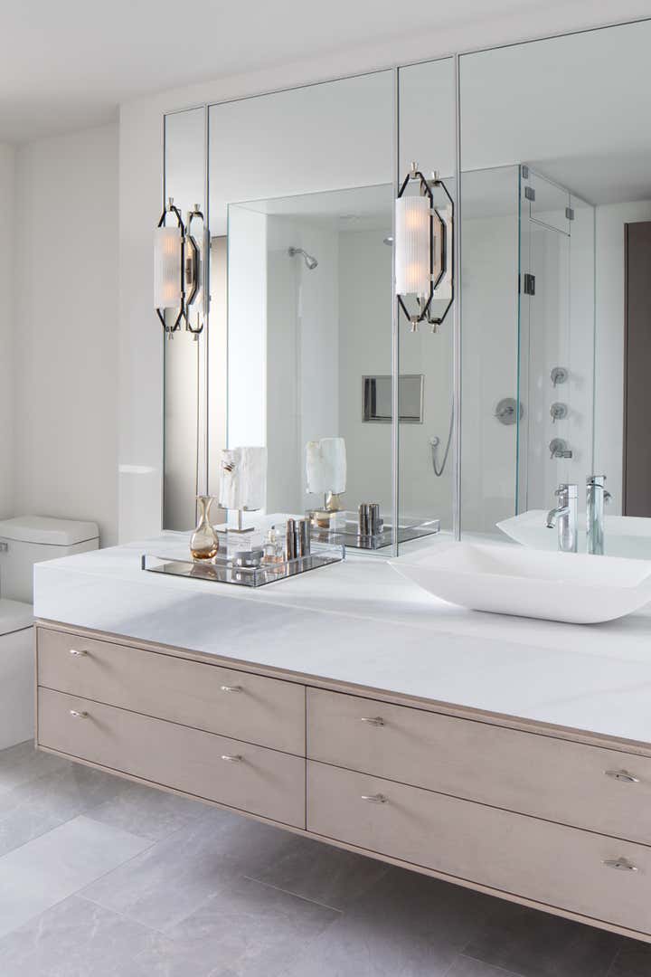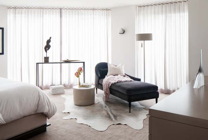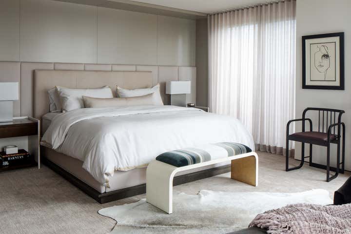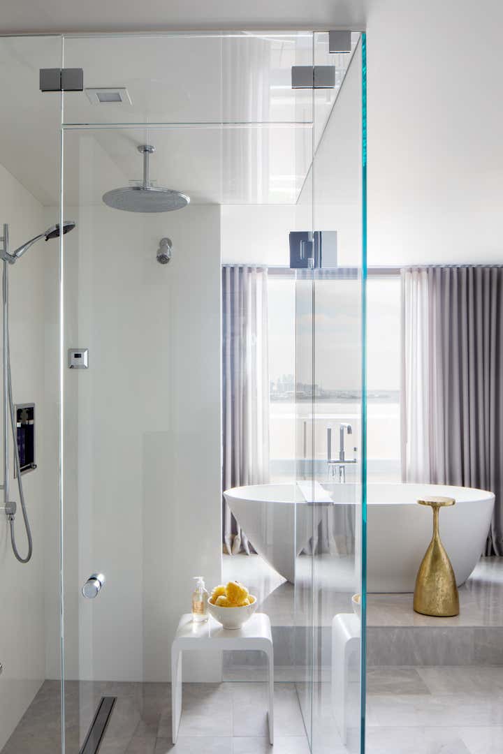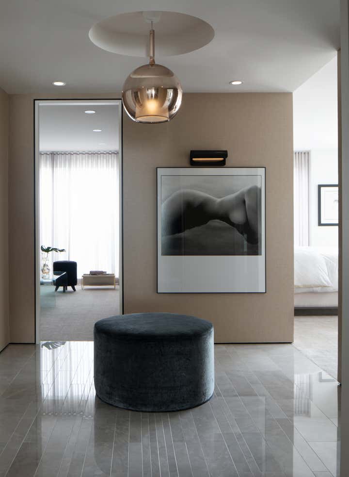 Calm, sophisticated and luxurious describe this spacious lakeside Penthouse overlooking Toronto’s expansive skyline on the shores of Lake Ontario. It was a wonderful opportunity to reinvent a 3,500 square foot residence for a well-traveled business woman. Our brief was simple: create a ‘hotel-like’ residence flexible to host large parties, while maintaining the intimacy of a private home. Demolishing a warren of angled partition walls to bare concrete slabs revealed a shell waiting to be transformed into a light-filled home. Our goal was to define the interior architecture and design a floor plan that divided the space into two separate zones, one public and one private. It was important to create a beautiful Foyer that introduced the design vision and visually felt connected to the open living area. A custom installation of three pivoting metal and tinted glass screens define the area without closing it off. A neutral colour story, quiet natural finishes, and understated silhouettes were incorporated to showcase the overall experience of viewing the spectacular vistas. A structural wall clad in pale limestone separates the Living Room from the Dining Area and Kitchen, while still keeping the flow of space open for entertaining large groups of friends and family. Original art and artisanal pieces were carefully curated for their beauty and easy elegance. A well-appointed private Master Bedroom Suite at the opposite end of the Penthouse, consists of a large Bedroom, comfortable Den, serene Bathroom and a spacious Closet all connected by a lovely Entry Hall that can be easily closed off with a set of custom pocket doors. Large expansions of glass bring in abundant natural light to accentuate the pure lines of the understated architecture creating a vision of contemporary luxury.
