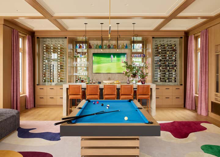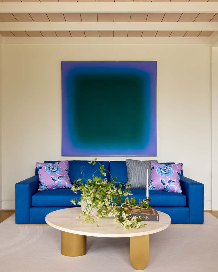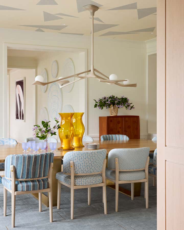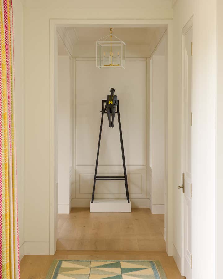 Within this architectural framework, Liz Caan &; Co. composed interiors that celebrate both artistry and warmth. A layered composition of color and form unfolds, where contemporary art, mid-century Scandinavian pieces, and French Art Deco treasures tell stories of time and place. A 1940s oak credenza attributed to Charles Dudouyt and a sculptural Grand Repos sofa by Guillerme & Chambron bring sculptural depth, while a Fontana Arte glass bowl and Kurt Østervig bar cabinet add moments of refinement and delight. Bold canvases by George Chaplin and Natasha Law spark dialogue with the serenity of Bastienne Schmidt’s sewn abstractions and Jeanette Fintz’s rhythmic compositions, as Aurora Cañero’s bronze Soccorista II lends a touch of whimsy.