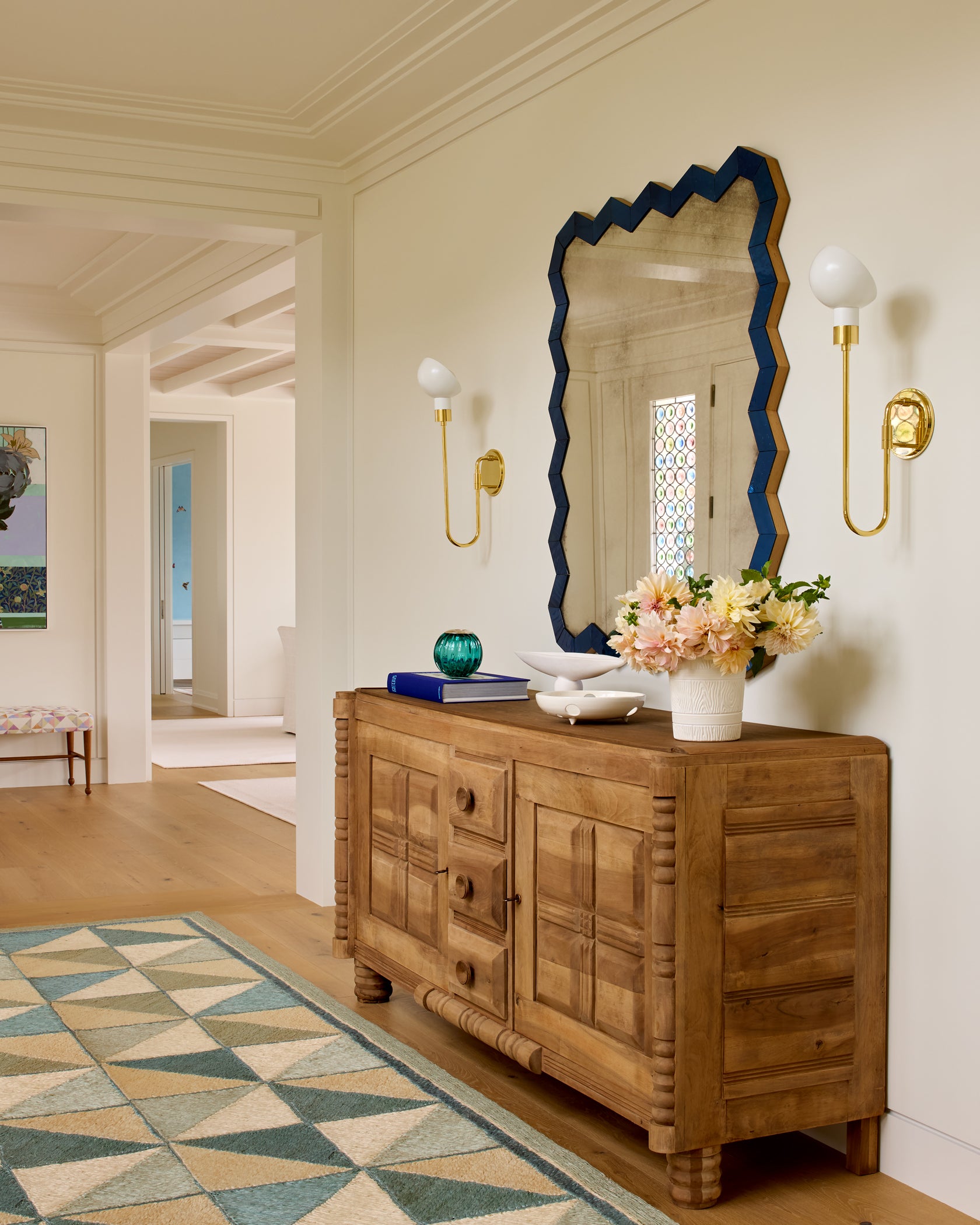 Within this architectural framework, Liz Caan &; Co. composed interiors that celebrate both artistry and warmth. A layered composition of color and form unfolds, where contemporary art, mid-century Scandinavian pieces, and French Art Deco treasures tell stories of time and place. A 1940s oak credenza attributed to Charles Dudouyt and a sculptural Grand Repos sofa by Guillerme & Chambron bring sculptural depth, while a Fontana Arte glass bowl and Kurt Østervig bar cabinet add moments of refinement and delight. Bold canvases by George Chaplin and Natasha Law spark dialogue with the serenity of Bastienne Schmidt’s sewn abstractions and Jeanette Fintz’s rhythmic compositions, as Aurora Cañero’s bronze Soccorista II lends a touch of whimsy.