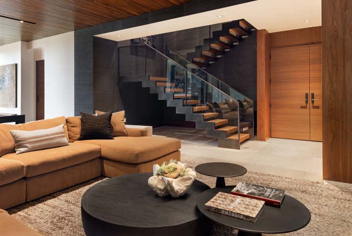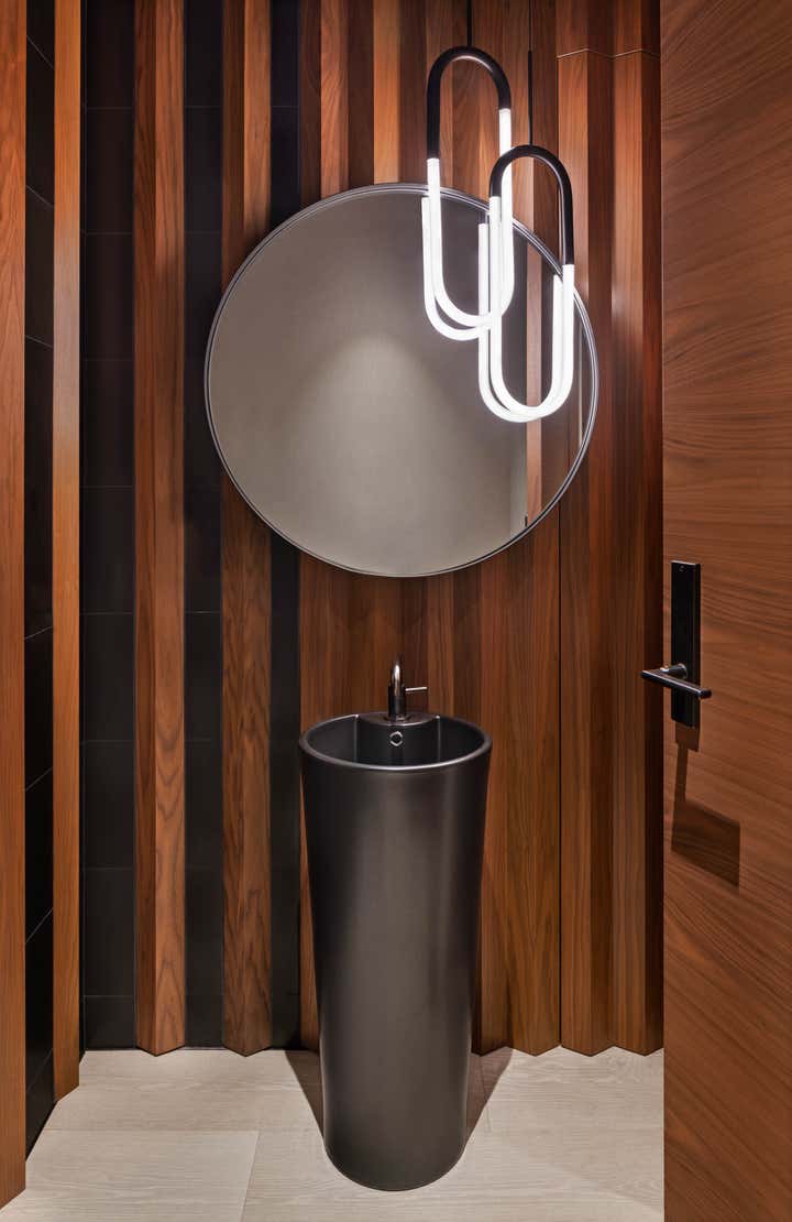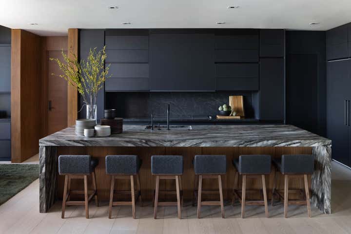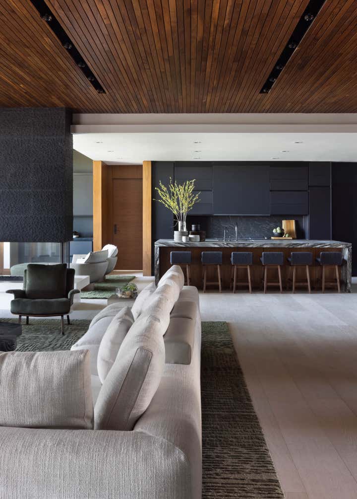 The two stacked units were combined with a steel and glass central staircase and united in materiality that included black streamlined modern cabinetry, ivory wide-planked ceruse oak flooring and the warmth of rich walnut in a narrow-slatted ceilings.