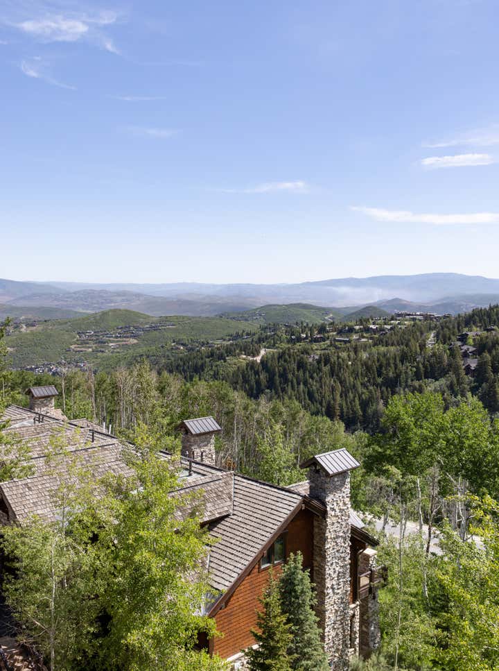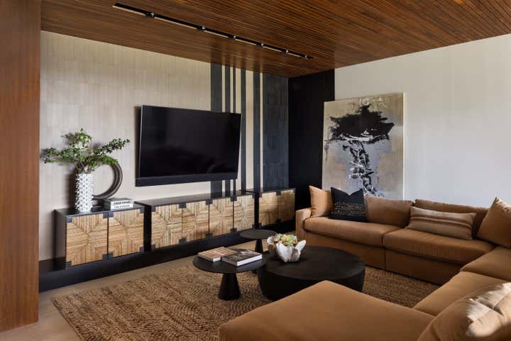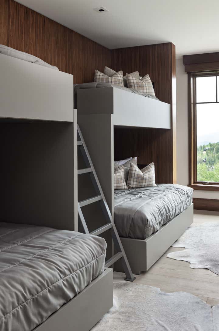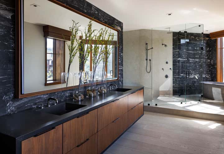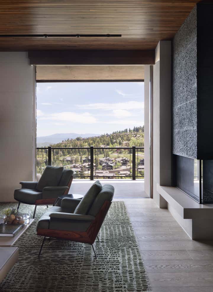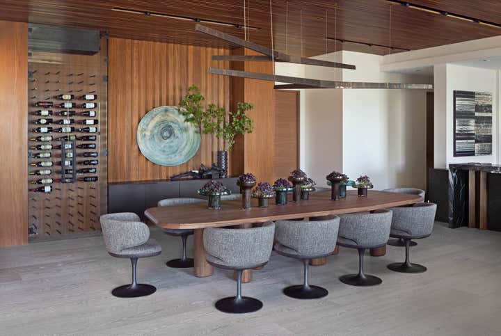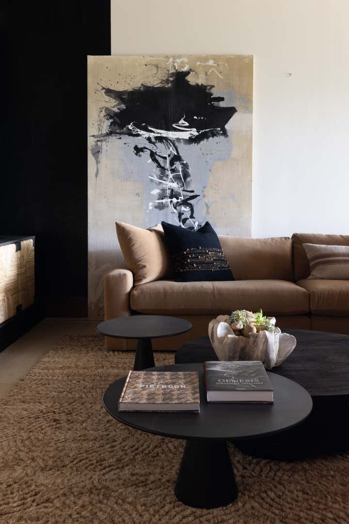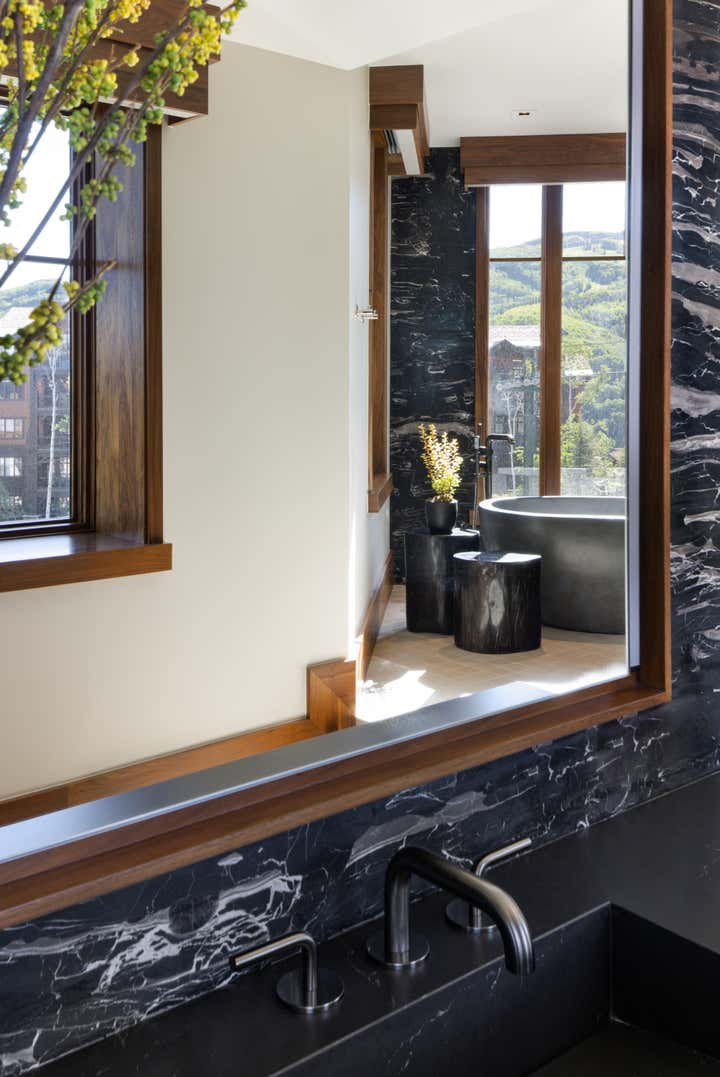 Subtle innuendos are made to the natural forms found in this mountain terrain. For example, the bronze Henge light fixture over the dining table evokes the feeling of collecting under tree branches in the most sophisticated iteration. The coffee table by Stephan Bishop is an ensemble of a staggered slice tree trunk. The curation of furnishings for a modern but bold simplicity is well exampled in the primary bedroom composition of the generous scaled bed that plays with its proportions of massing, against a black gauze wall texture and a striking abstract expressionism art piece.