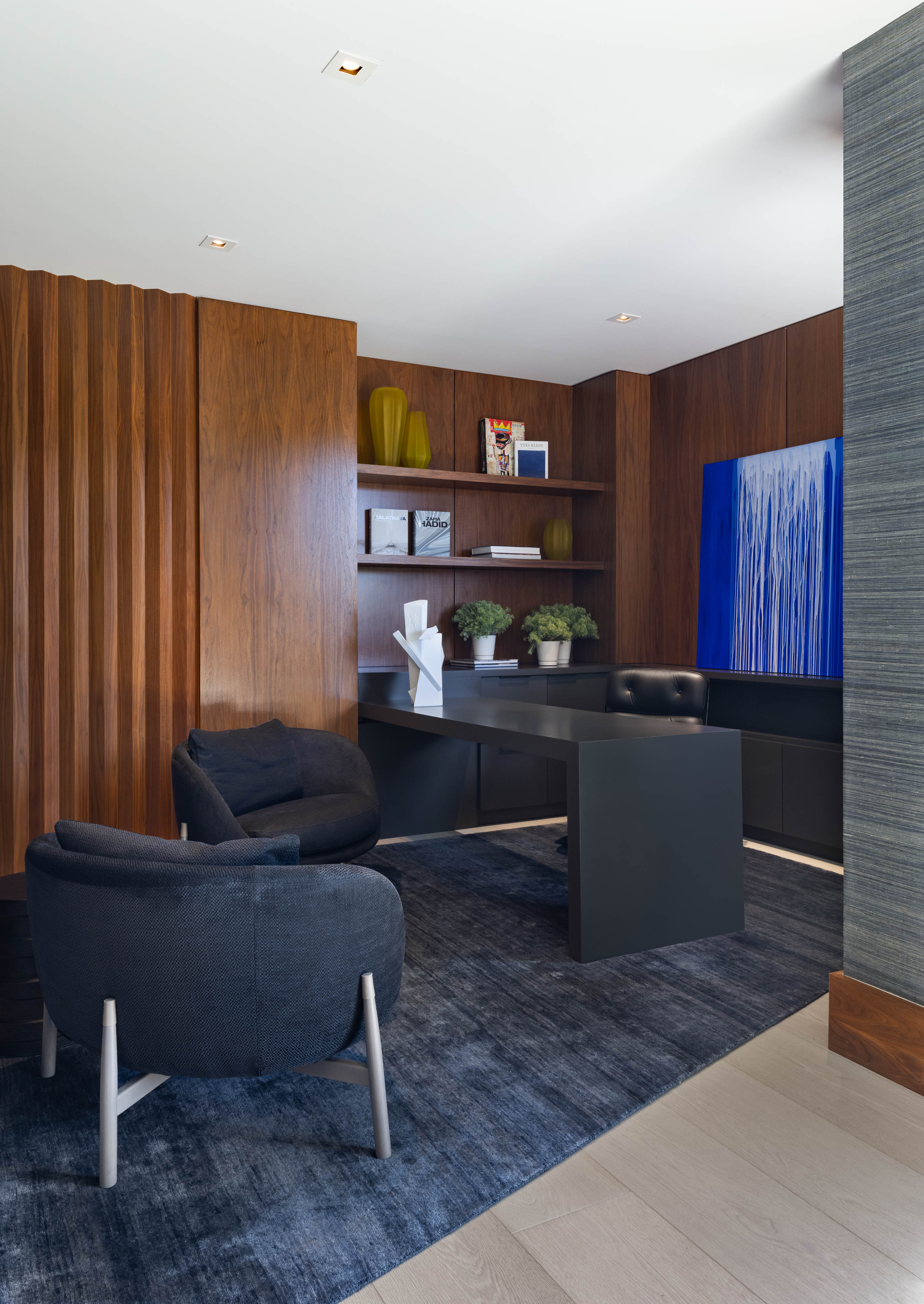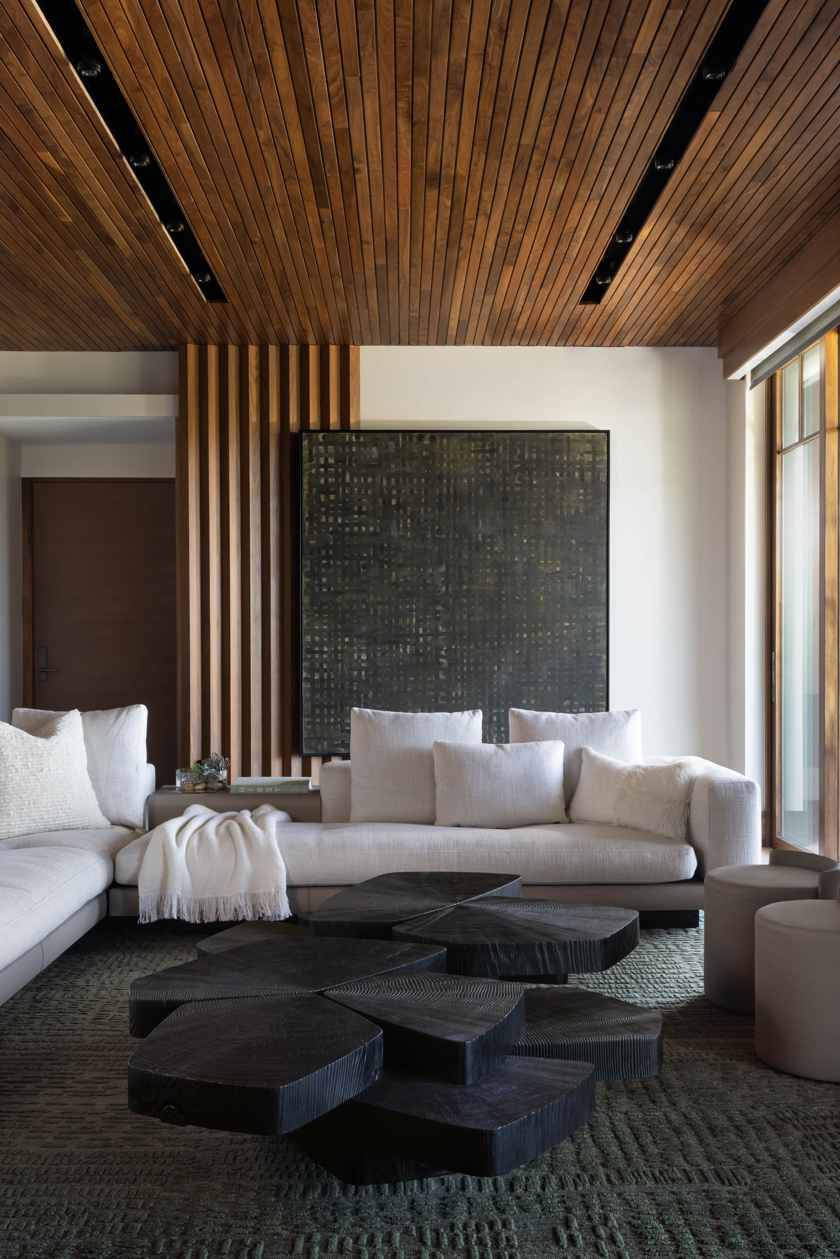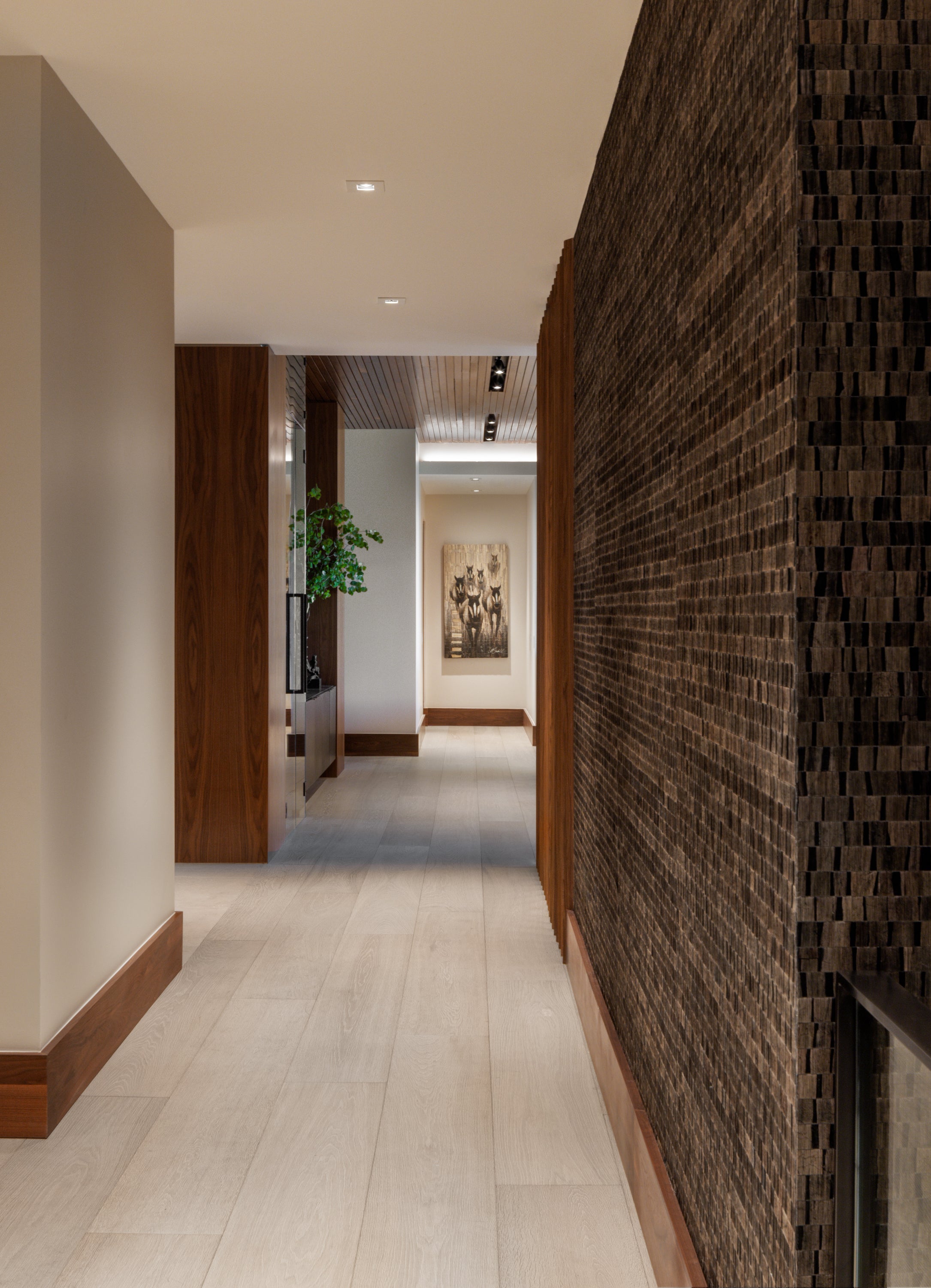 The two stacked units were combined with a steel and glass central staircase and united in materiality that included black streamlined modern cabinetry, ivory wide-planked ceruse oak flooring and the warmth of rich walnut in a narrow-slatted ceilings.