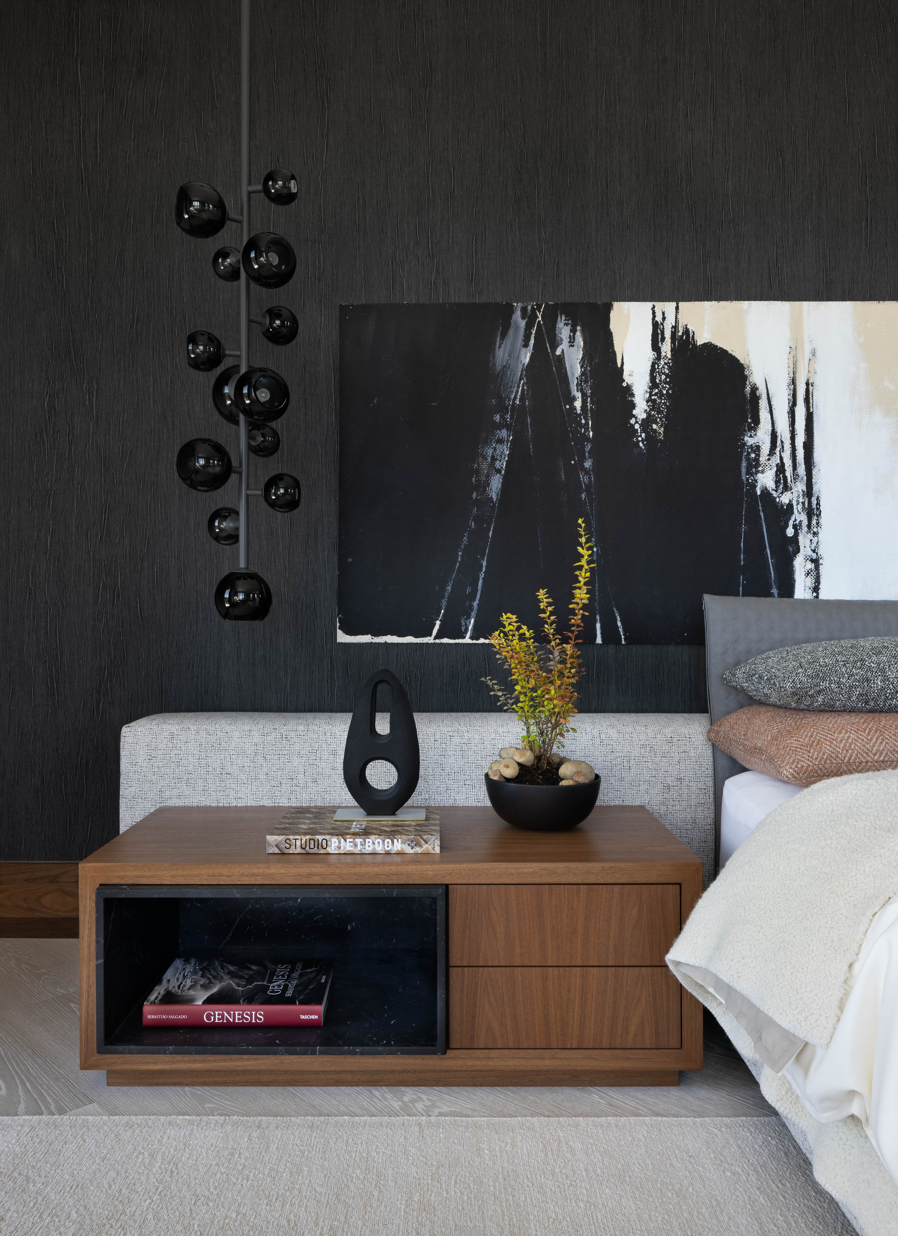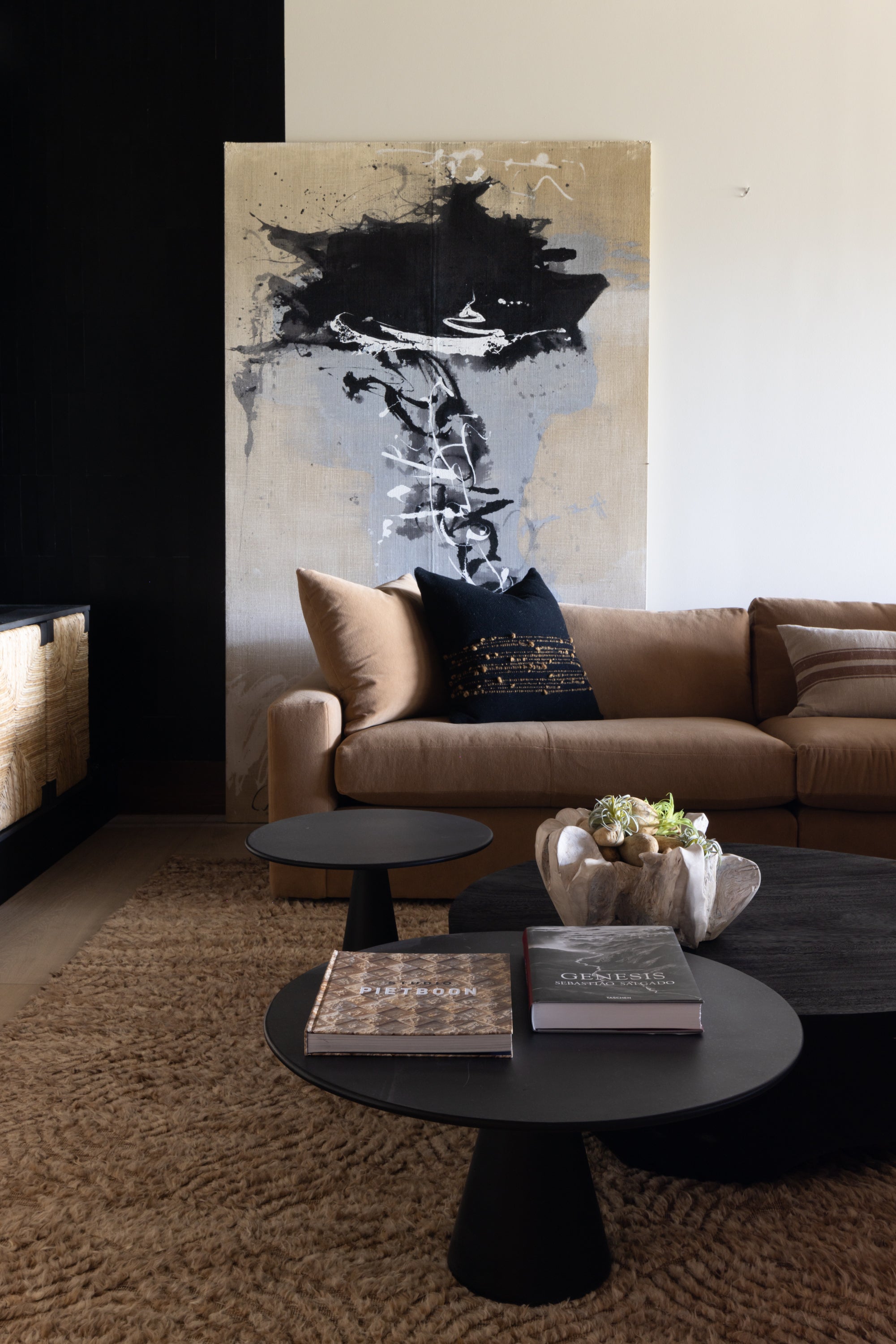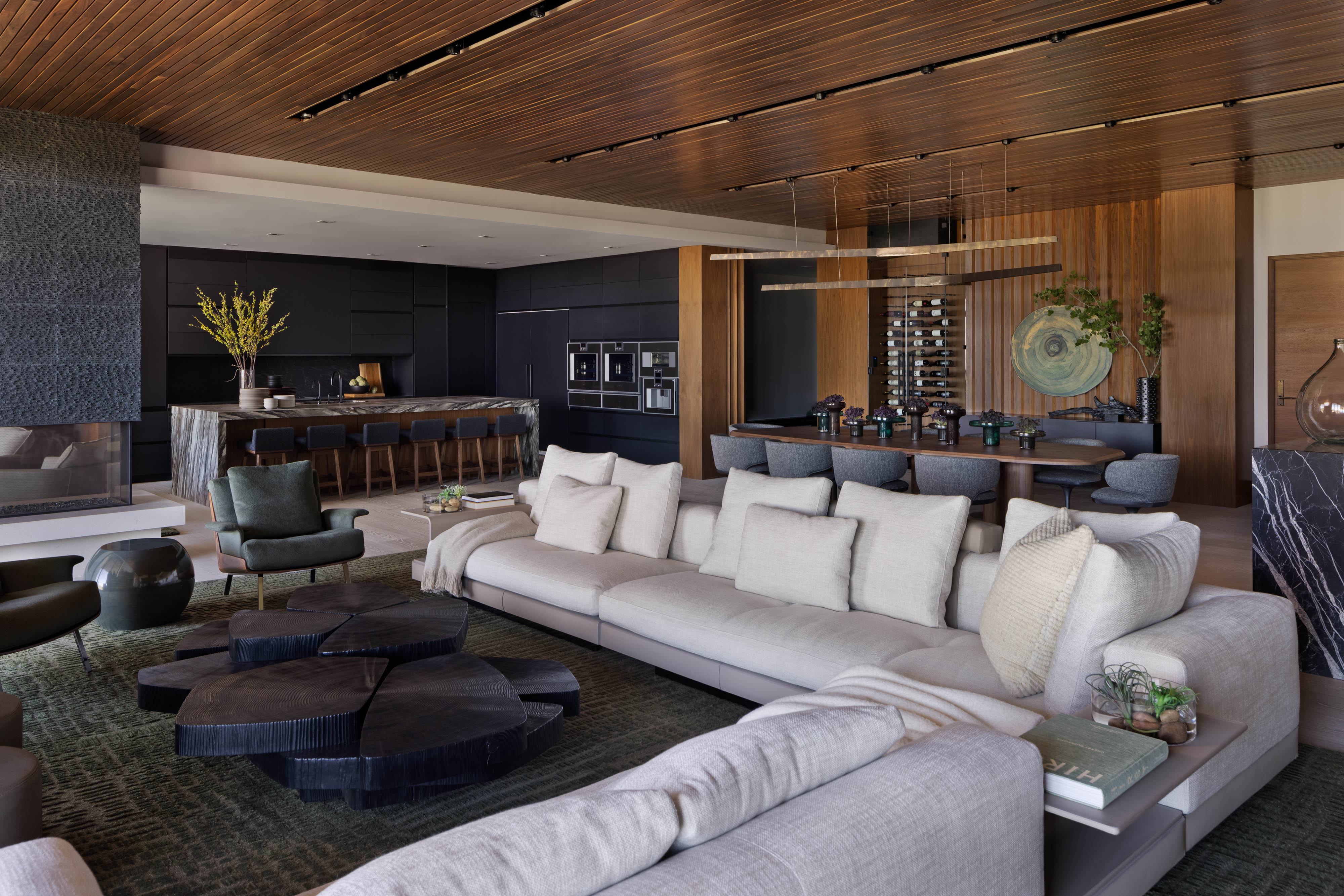 Subtle innuendos are made to the natural forms found in this mountain terrain. For example, the bronze Henge light fixture over the dining table evokes the feeling of collecting under tree branches in the most sophisticated iteration. The coffee table by Stephan Bishop is an ensemble of a staggered slice tree trunk. The curation of furnishings for a modern but bold simplicity is well exampled in the primary bedroom composition of the generous scaled bed that plays with its proportions of massing, against a black gauze wall texture and a striking abstract expressionism art piece.