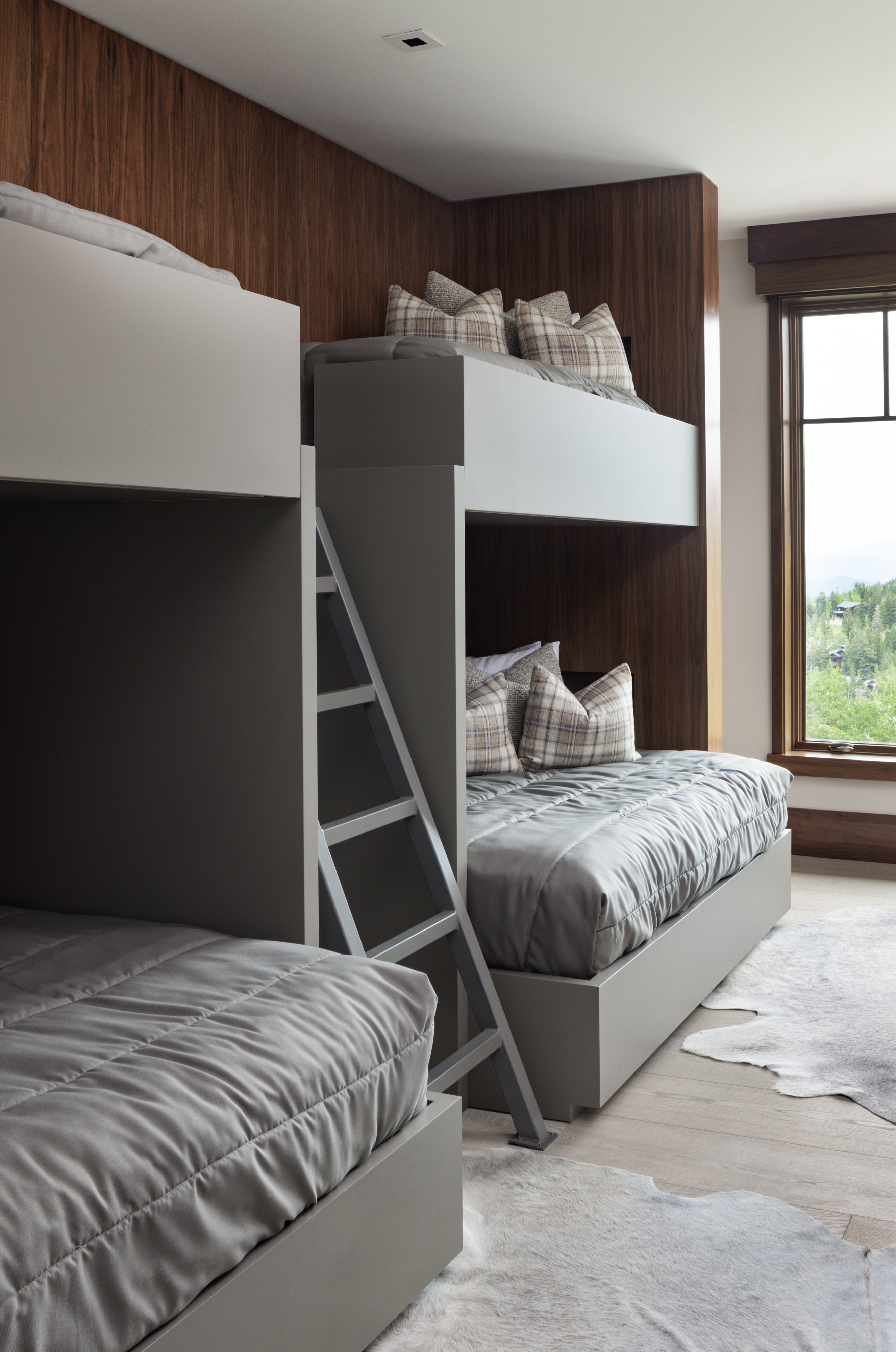 The walnut is also repeated in paneling to enhance the architectural interior massing and add verticality by using a bespoke pyramid-shaped detail that expands the space upwards. The kitchen is simplified with blended black perimeter cabinetry and black leathered granite countertops as a background for the strong organic movement of the island granite. The lower floor includes and après ski area with a deep bittersweet Mohair sectional and leather tiled walls repeating black and deep ivory in a vertical graphic pattern for game playing and movie watching.