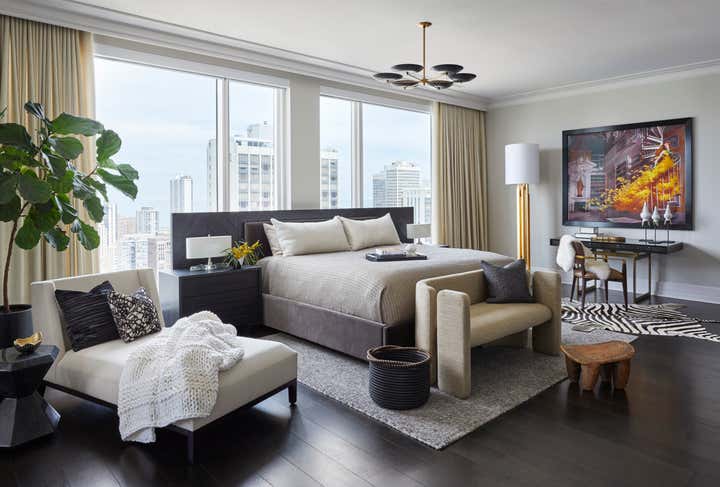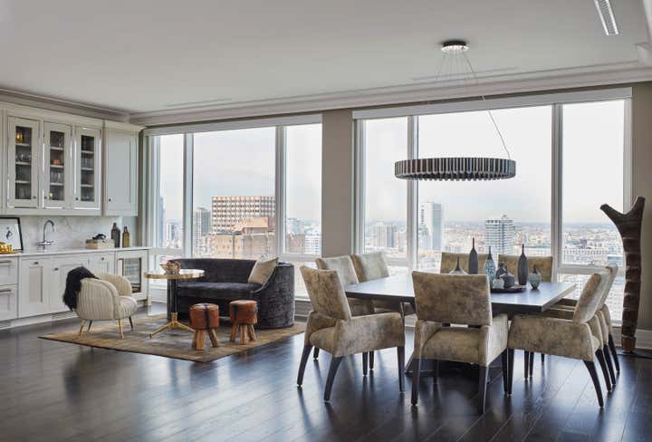 Leaving behind a traditional home in the suburbs of Chicago, this couple wanted a home that was a reflection of their modern and edgy style. Beautiful artwork and bold statements are a standout through this Gold Coast high-rise. The openness of the living area allowed us to create unique and personalized spaces like the coffee/breakfast bar, a dining area and two seating areas where stunning views of the city can be enjoyed. The full-scope design plan enabled us to select high-end luxury finishes, custom cabinetry, and utilize our curated list of expert artisans to furnish the interior. Modern interiors, warm textures, edgy artwork and dramatic stone features create a home that is representative of the evolution of their style.
