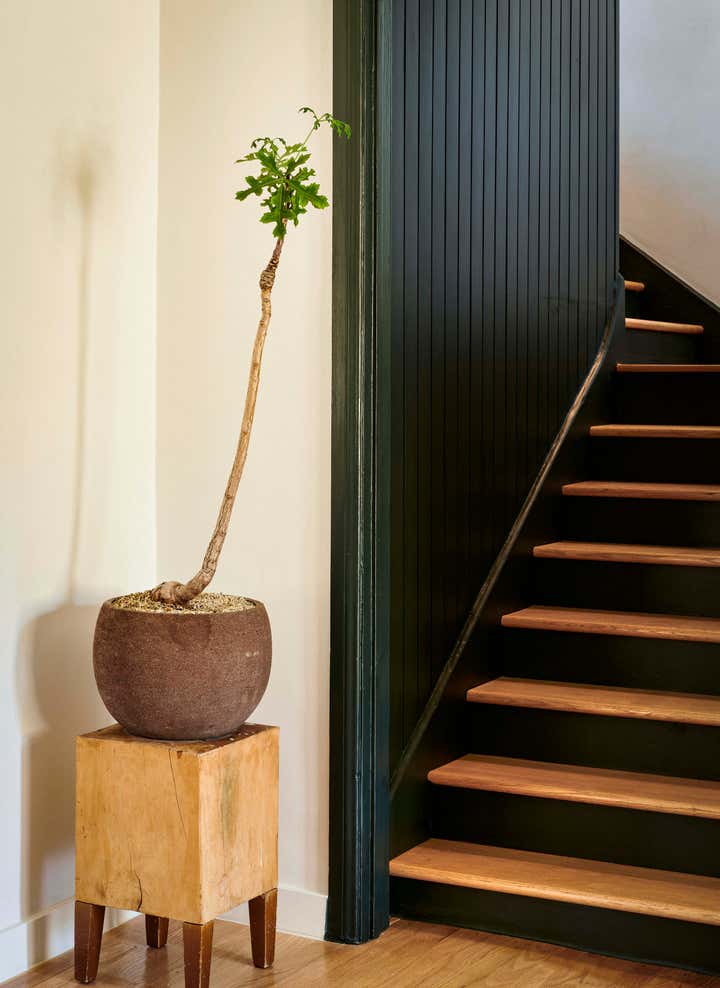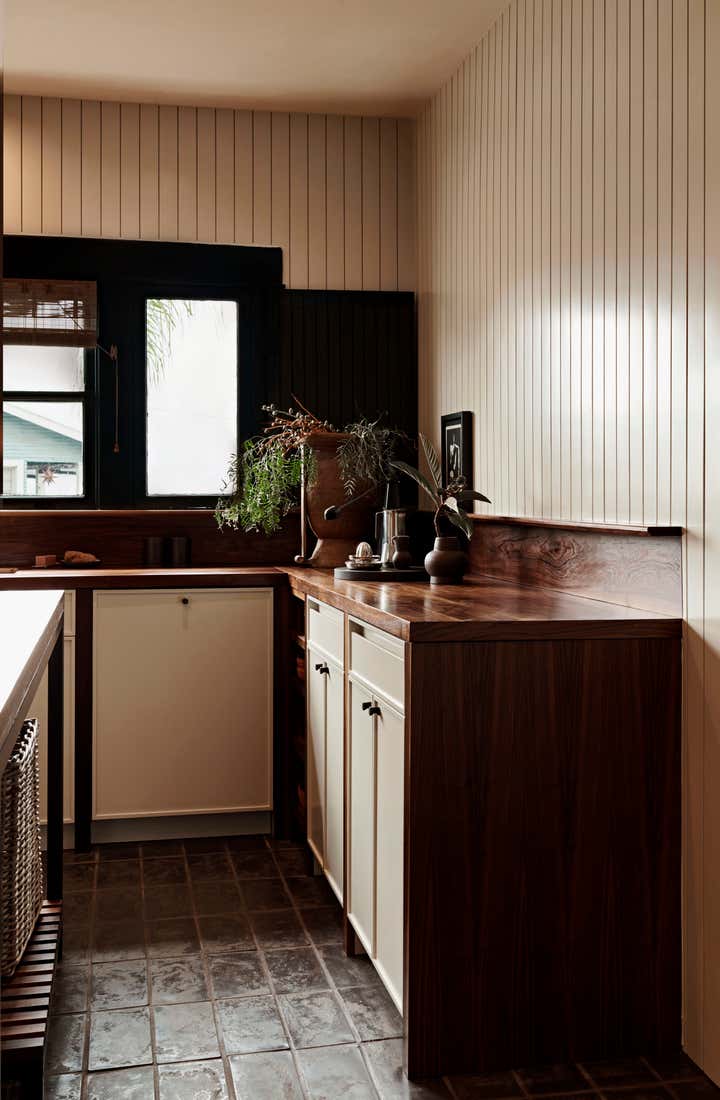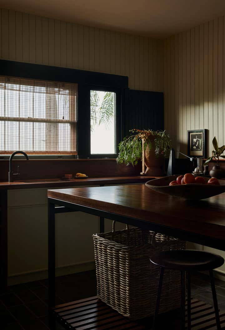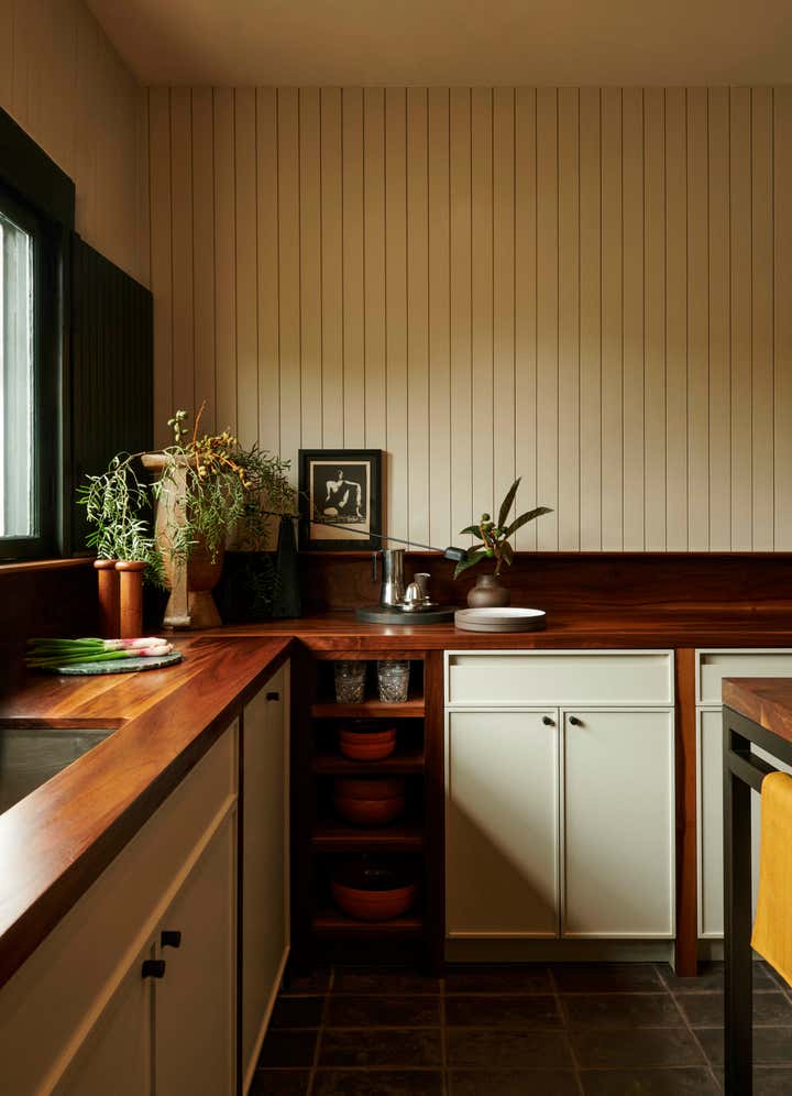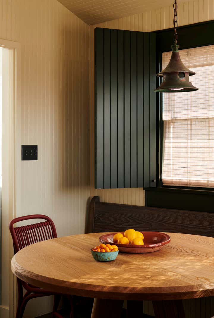 Our approach was to reinterpret a vernacular heritage while ensuring the design remained relevant to contemporary living. Flexible programming, local finishes, and considered detailing lend themselves to a home that is both respectful of the past and conducive to the present. The kitchen is lined with painted groove paneling, walnut slab counters, and locally made black terracotta tile. An antique copper lantern sits above a custom banquette designed by Bernatz.