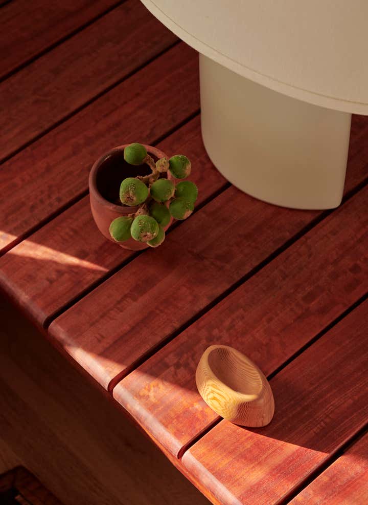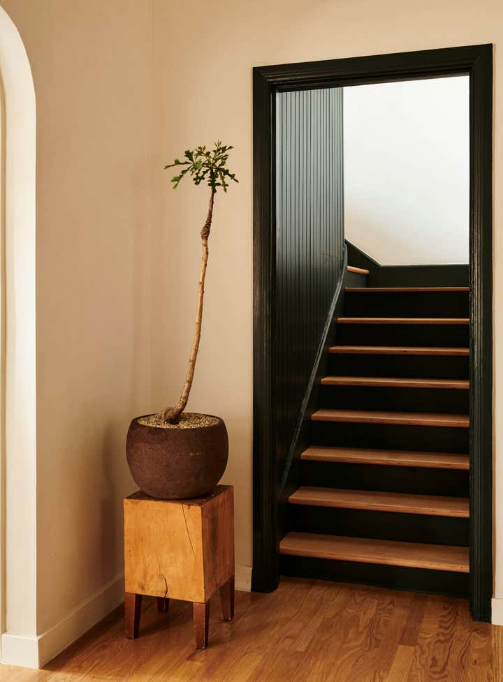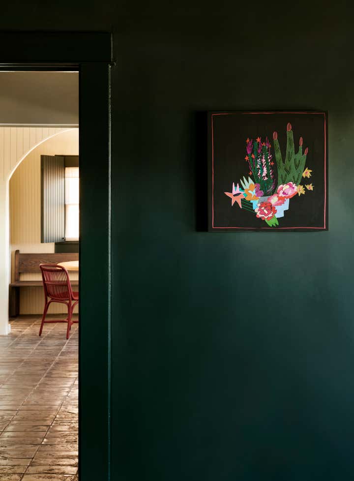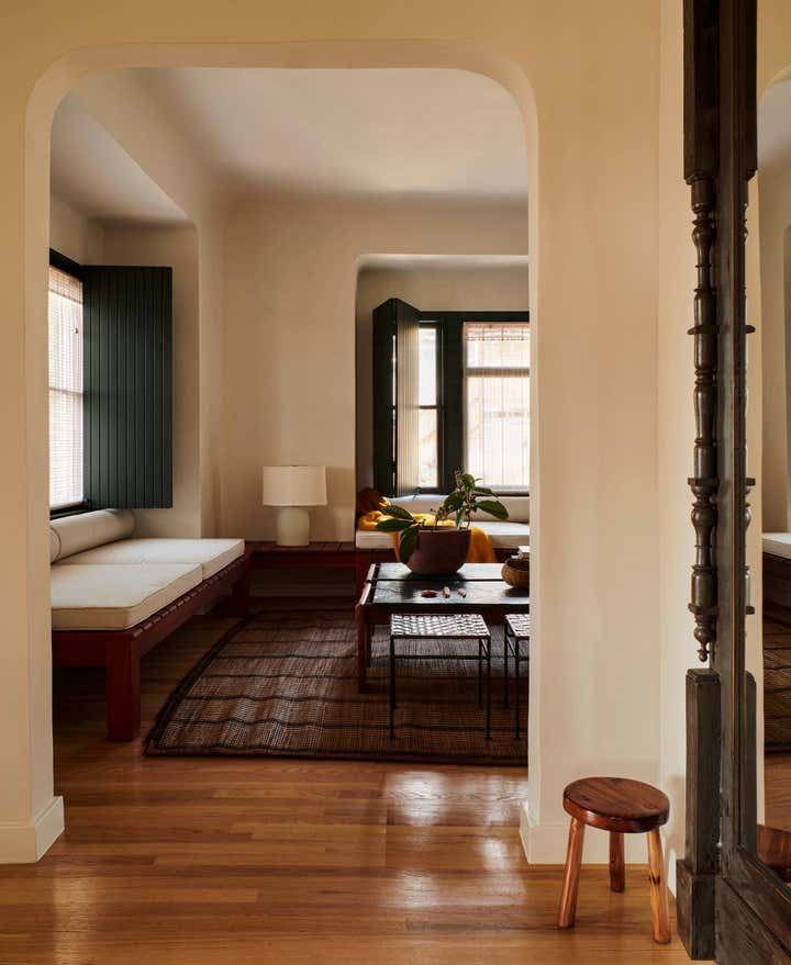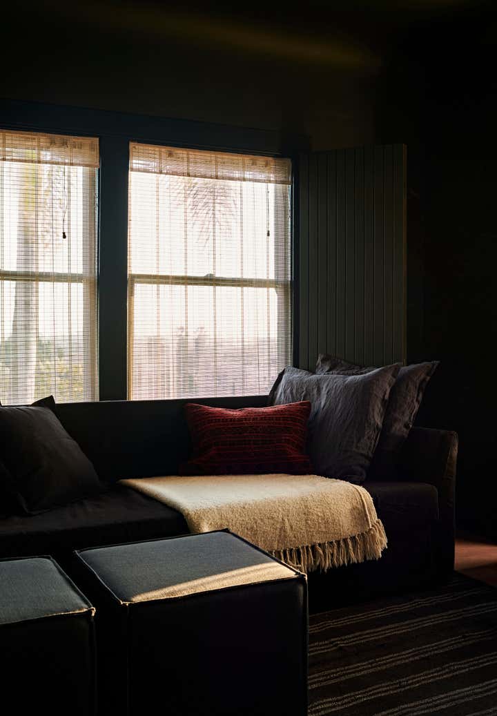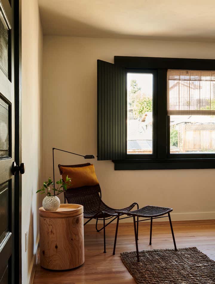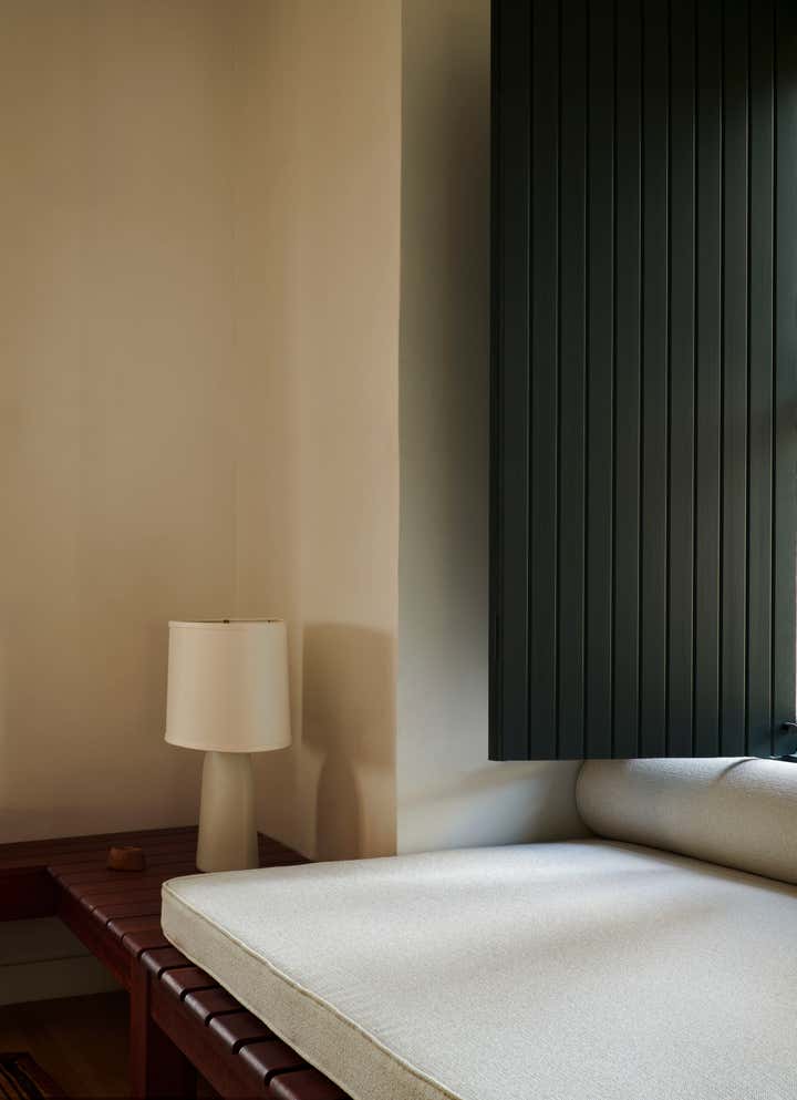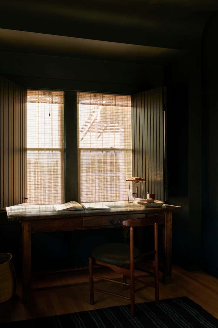 Primary dressed in neutrals, the living room is lined by moody, green-toned shutters and is anchored by an oiled, red Gum Eucalyptus built in sofa made especially for the space. Tying the spaces together, the adjacent office utilizes the same dark green shutters. An antique Mexican desk, copper Lindsay Adelman table lamp, and repurposed Greta Grossman chair flank the westward view of the downtown skyline. The bedroom features vaulted, lime-washed walls and ceilings and a custom redwood headboard and furniture.