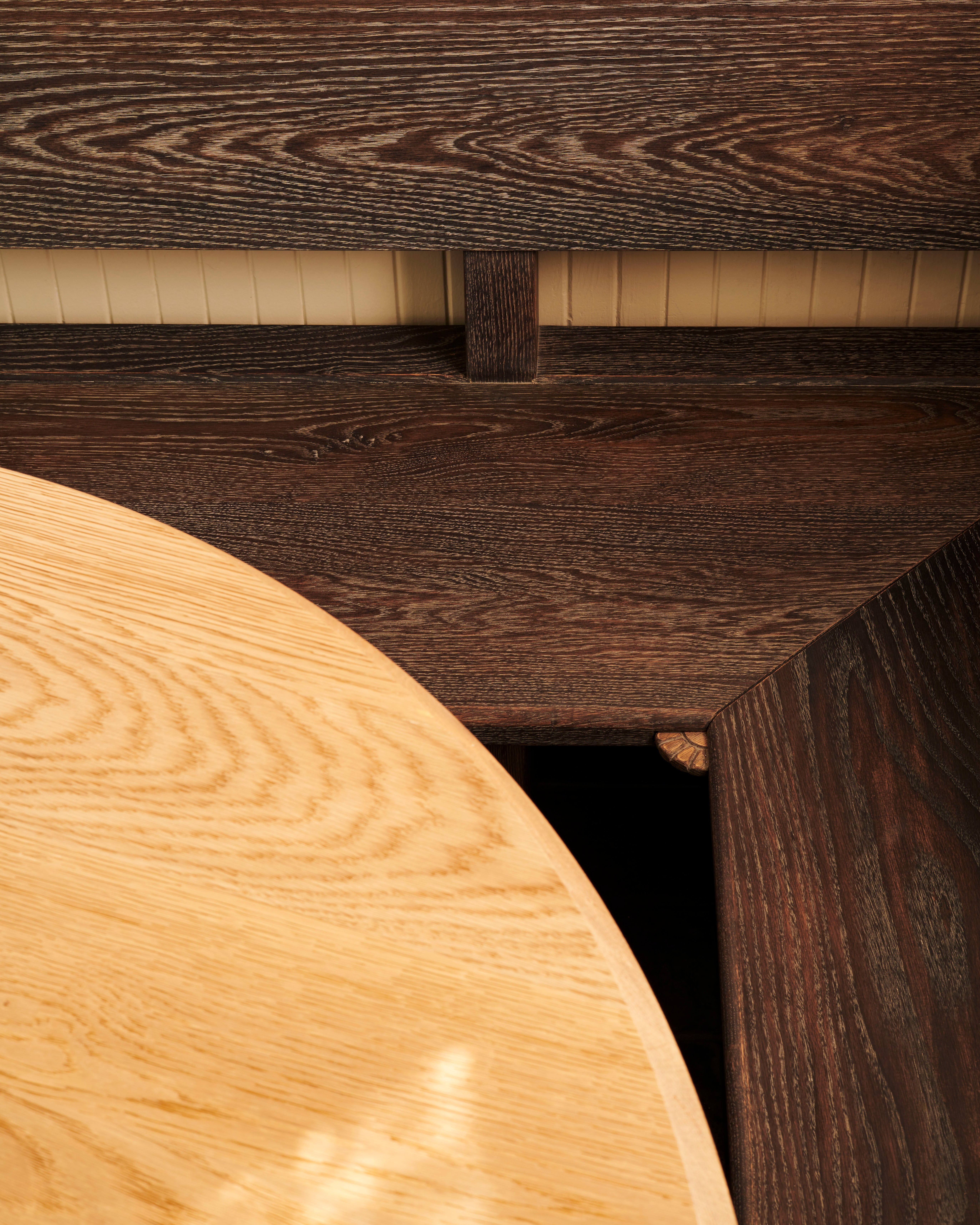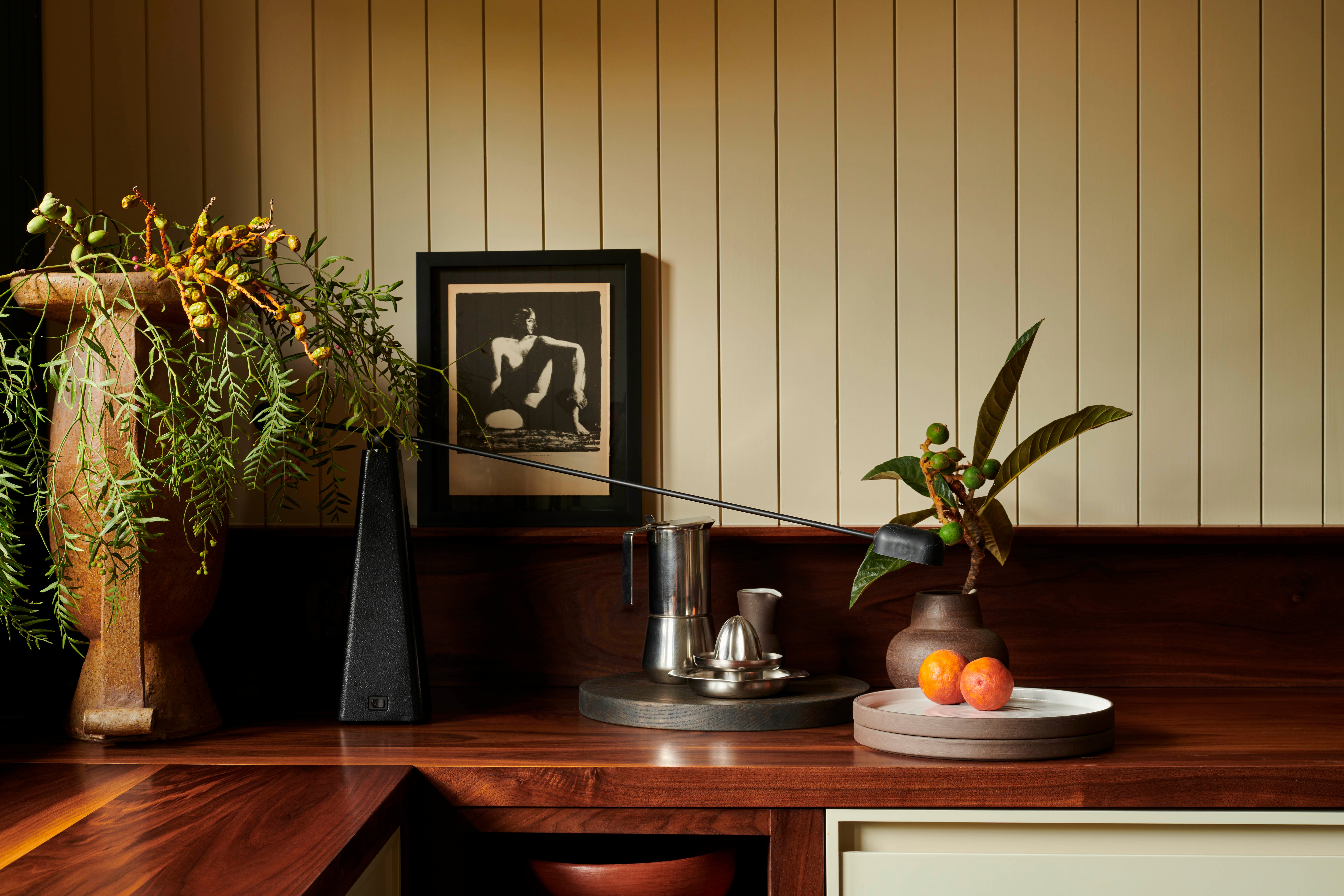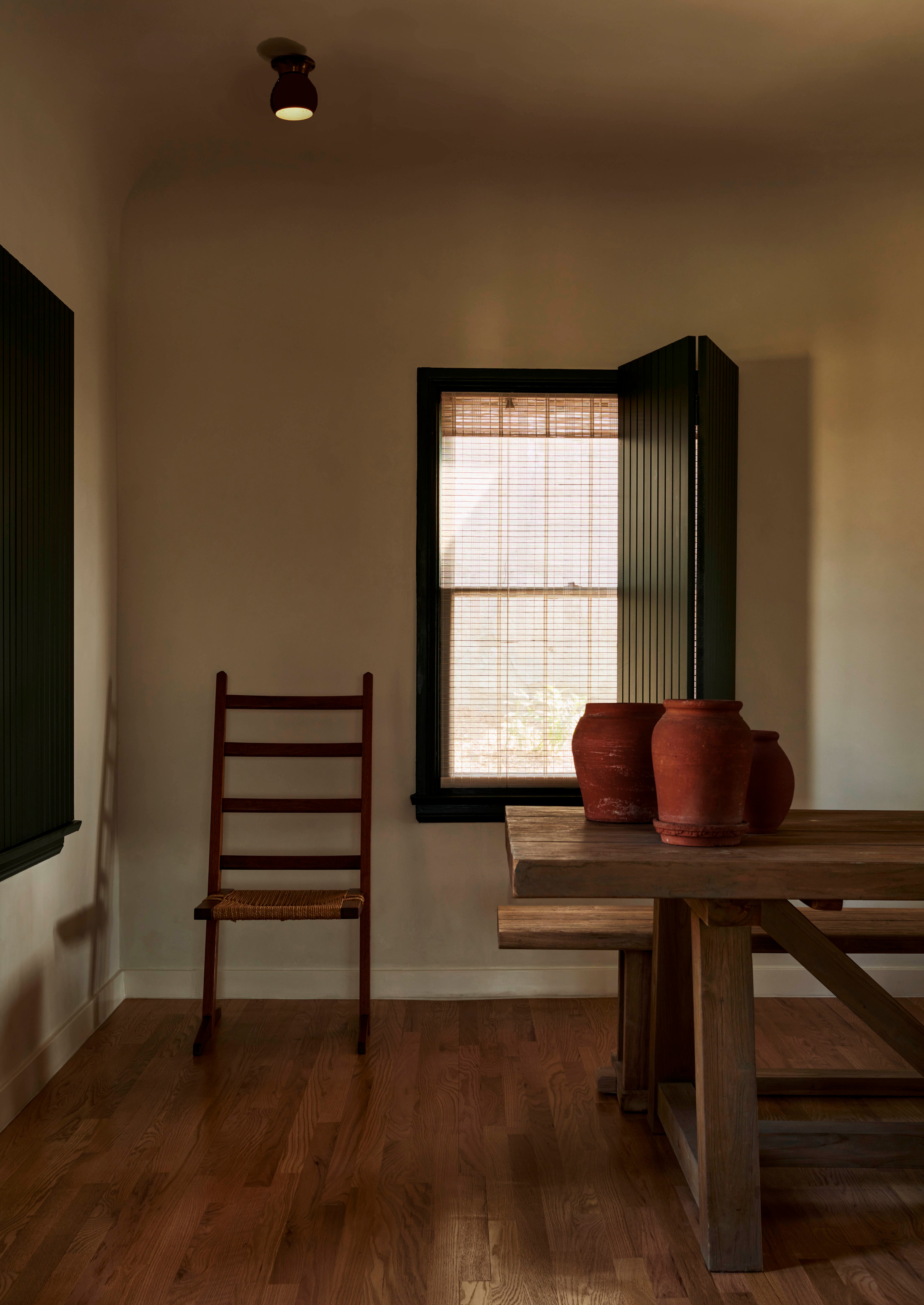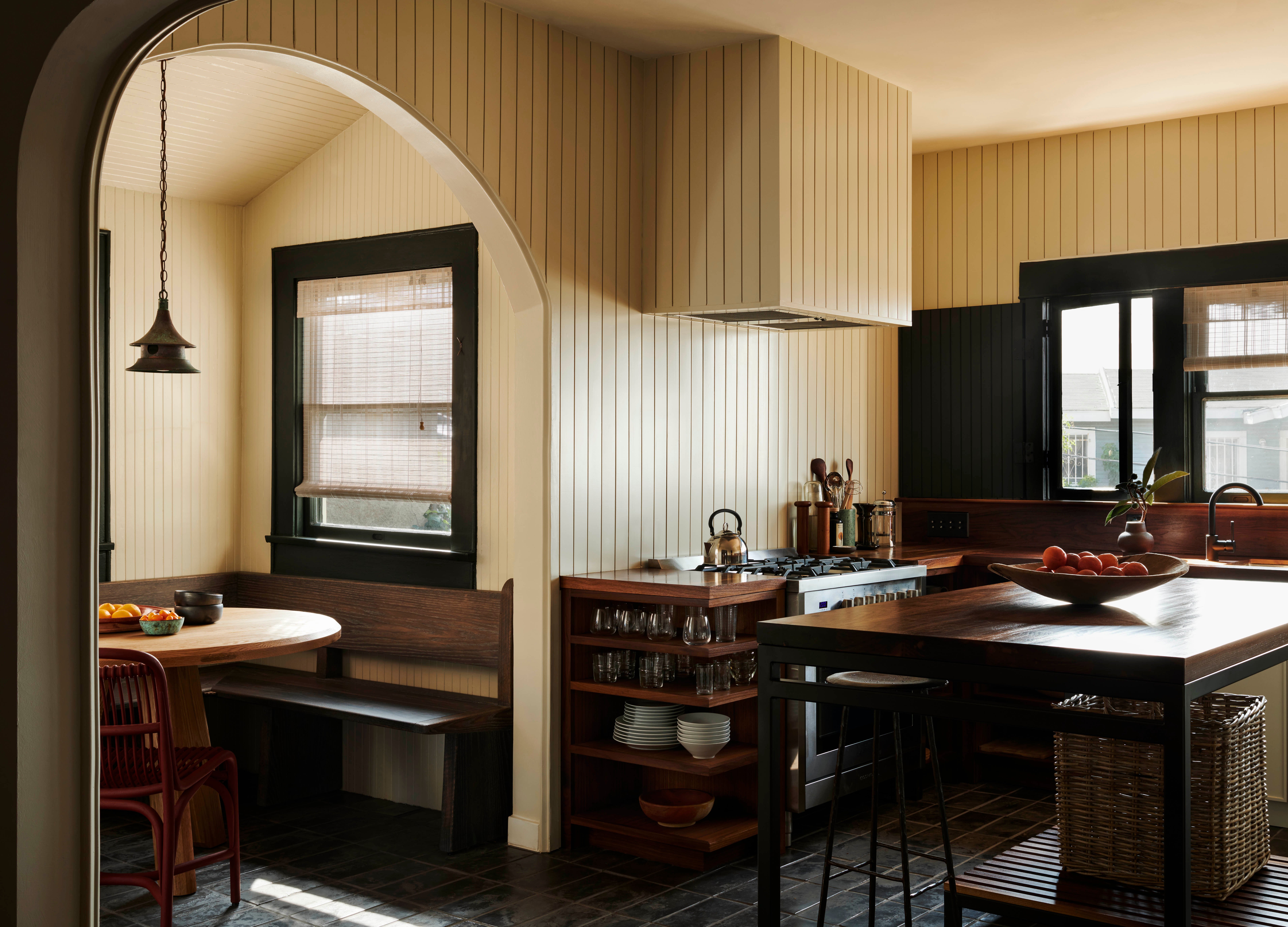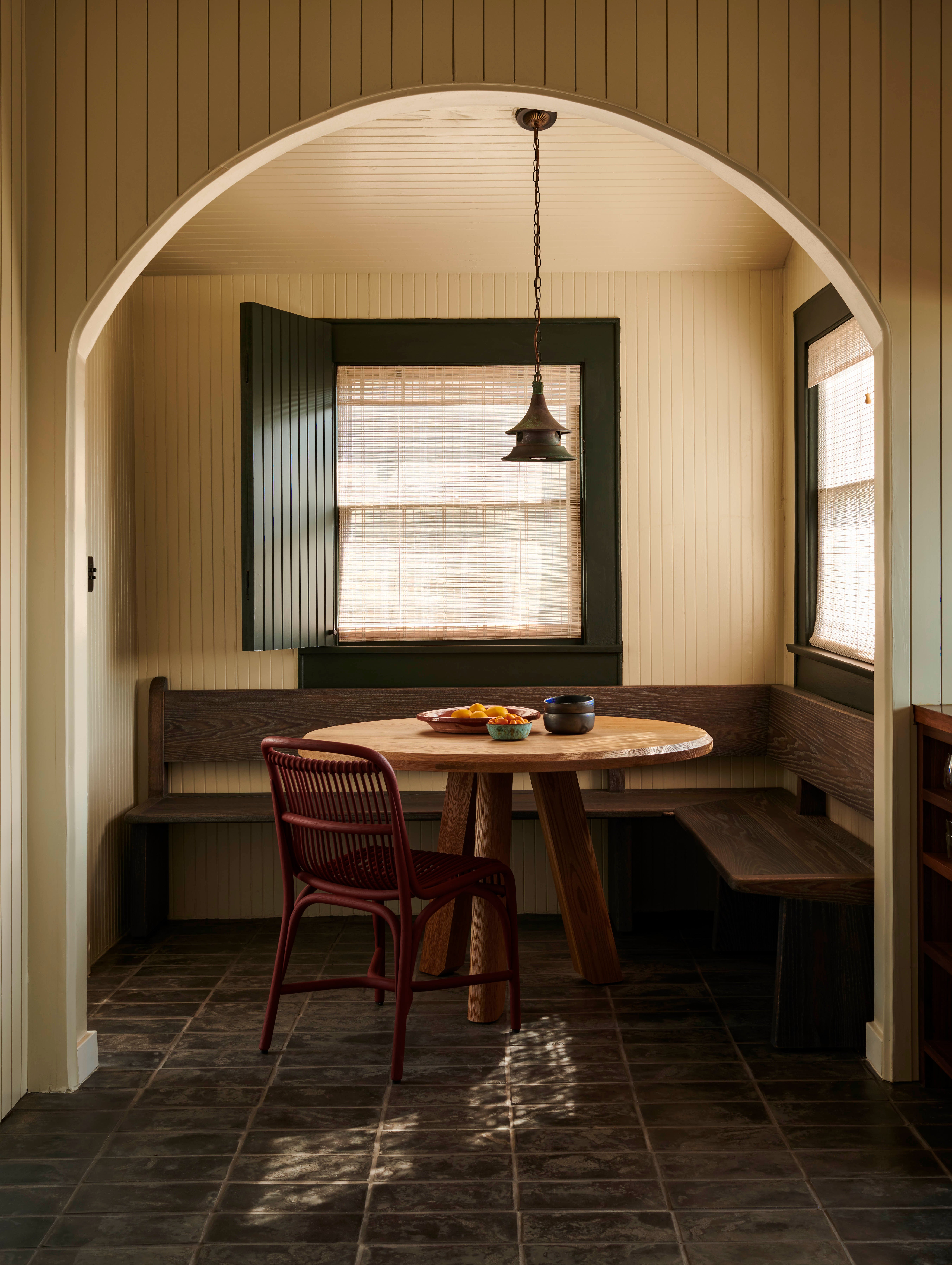 Our approach was to reinterpret a vernacular heritage while ensuring the design remained relevant to contemporary living. Flexible programming, local finishes, and considered detailing lend themselves to a home that is both respectful of the past and conducive to the present. The kitchen is lined with painted groove paneling, walnut slab counters, and locally made black terracotta tile. An antique copper lantern sits above a custom banquette designed by Bernatz.