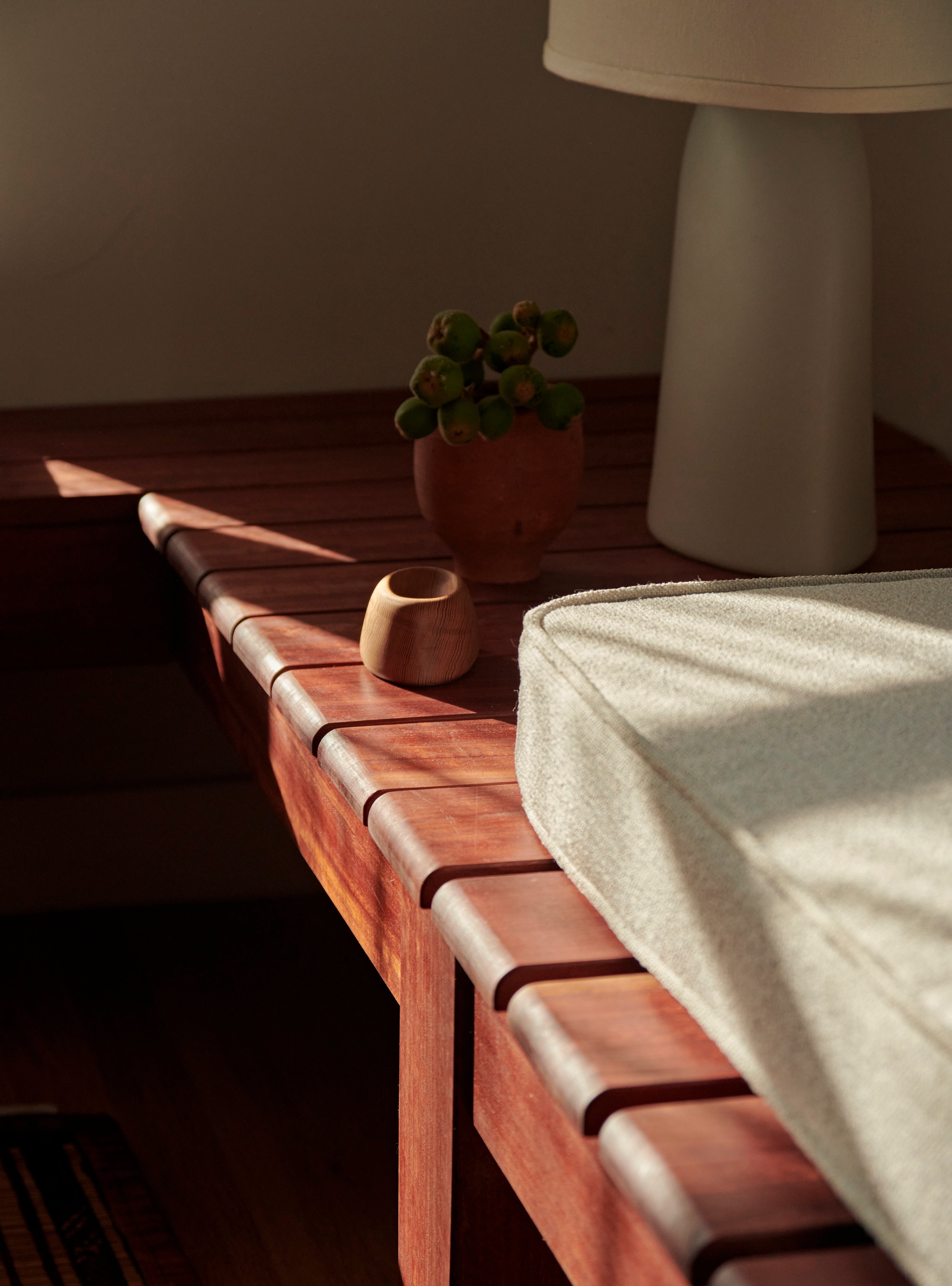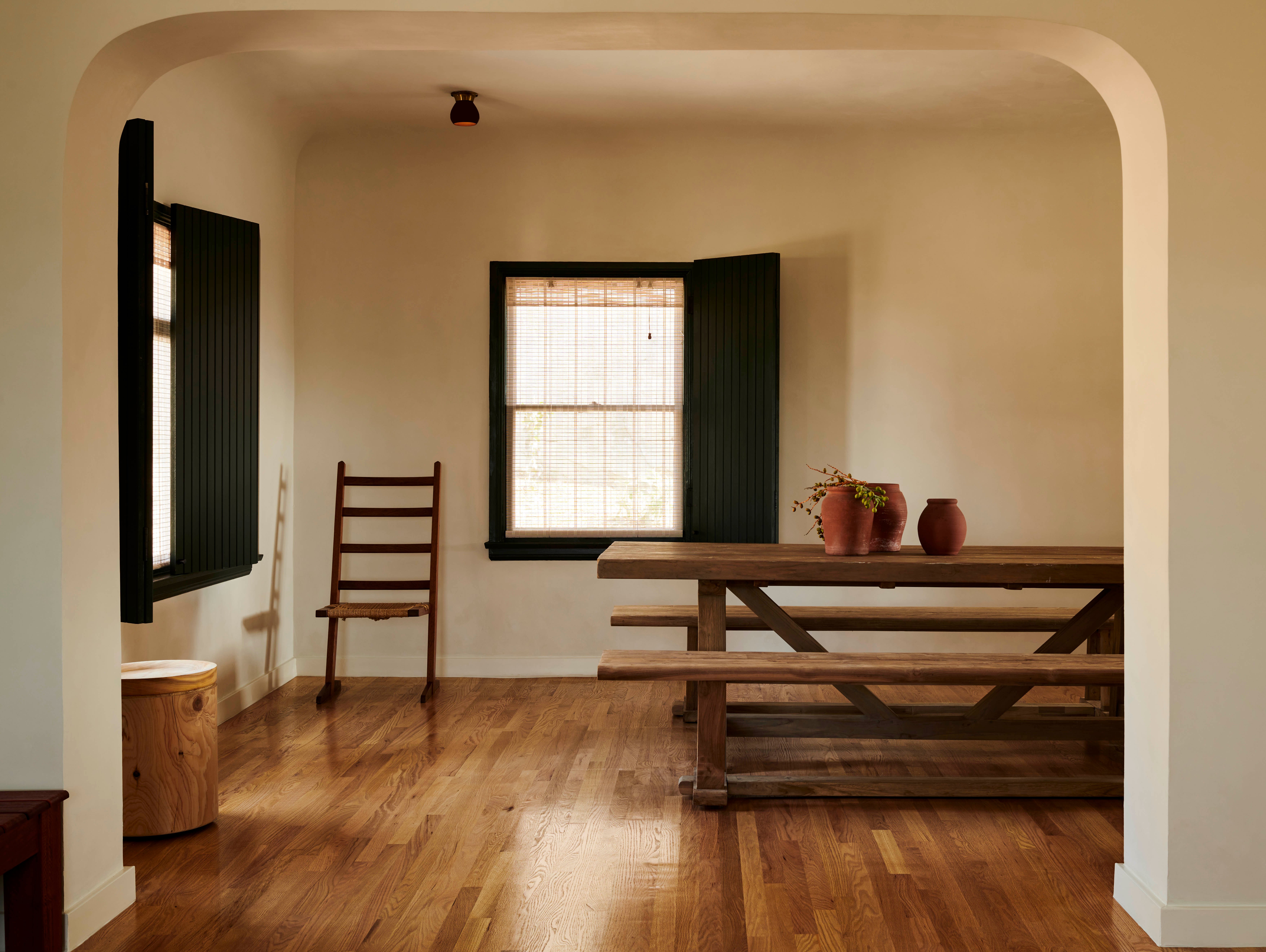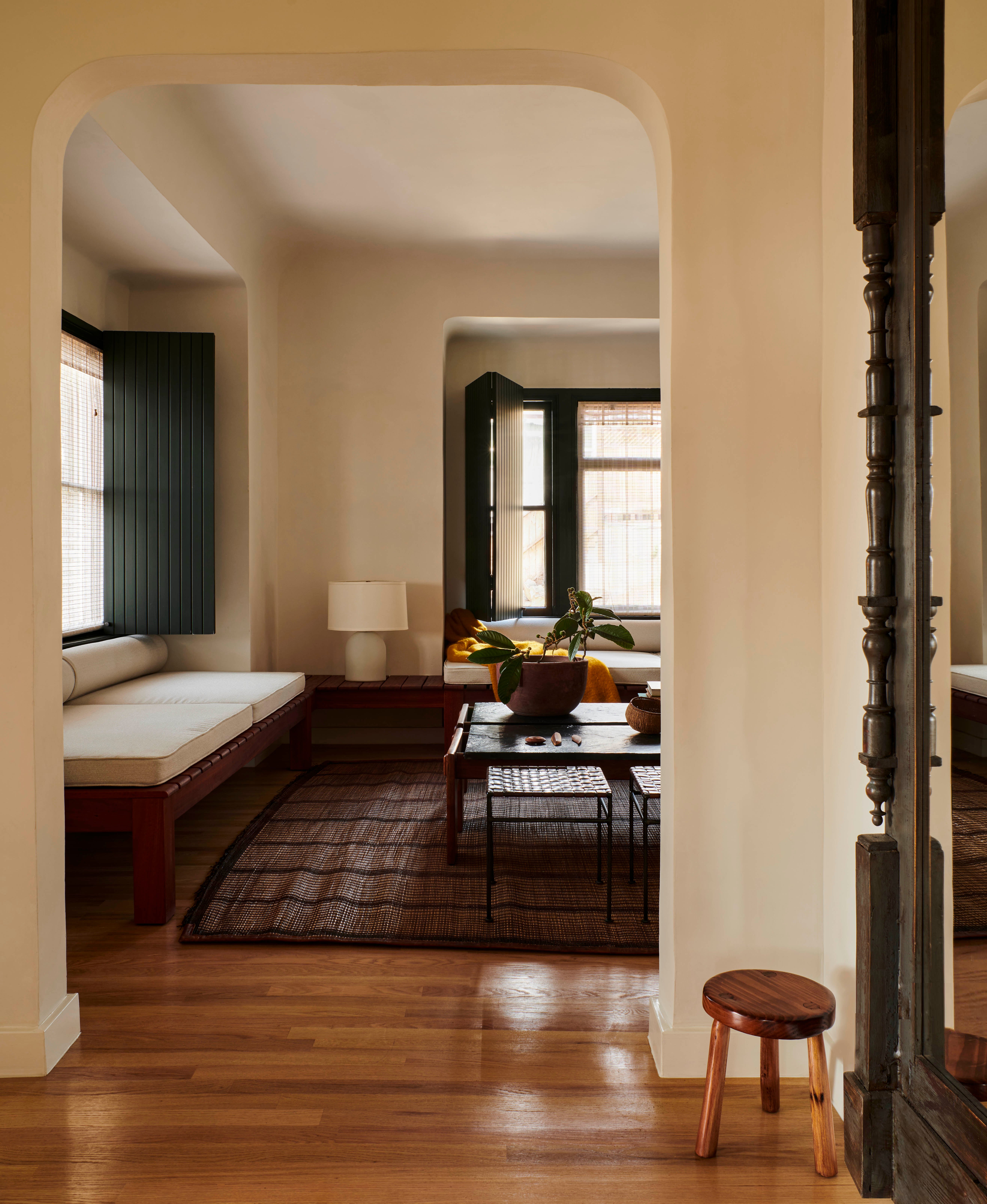 Primary dressed in neutrals, the living room is lined by moody, green-toned shutters and is anchored by an oiled, red Gum Eucalyptus built in sofa made especially for the space. Tying the spaces together, the adjacent office utilizes the same dark green shutters. An antique Mexican desk, copper Lindsay Adelman table lamp, and repurposed Greta Grossman chair flank the westward view of the downtown skyline. The bedroom features vaulted, lime-washed walls and ceilings and a custom redwood headboard and furniture.