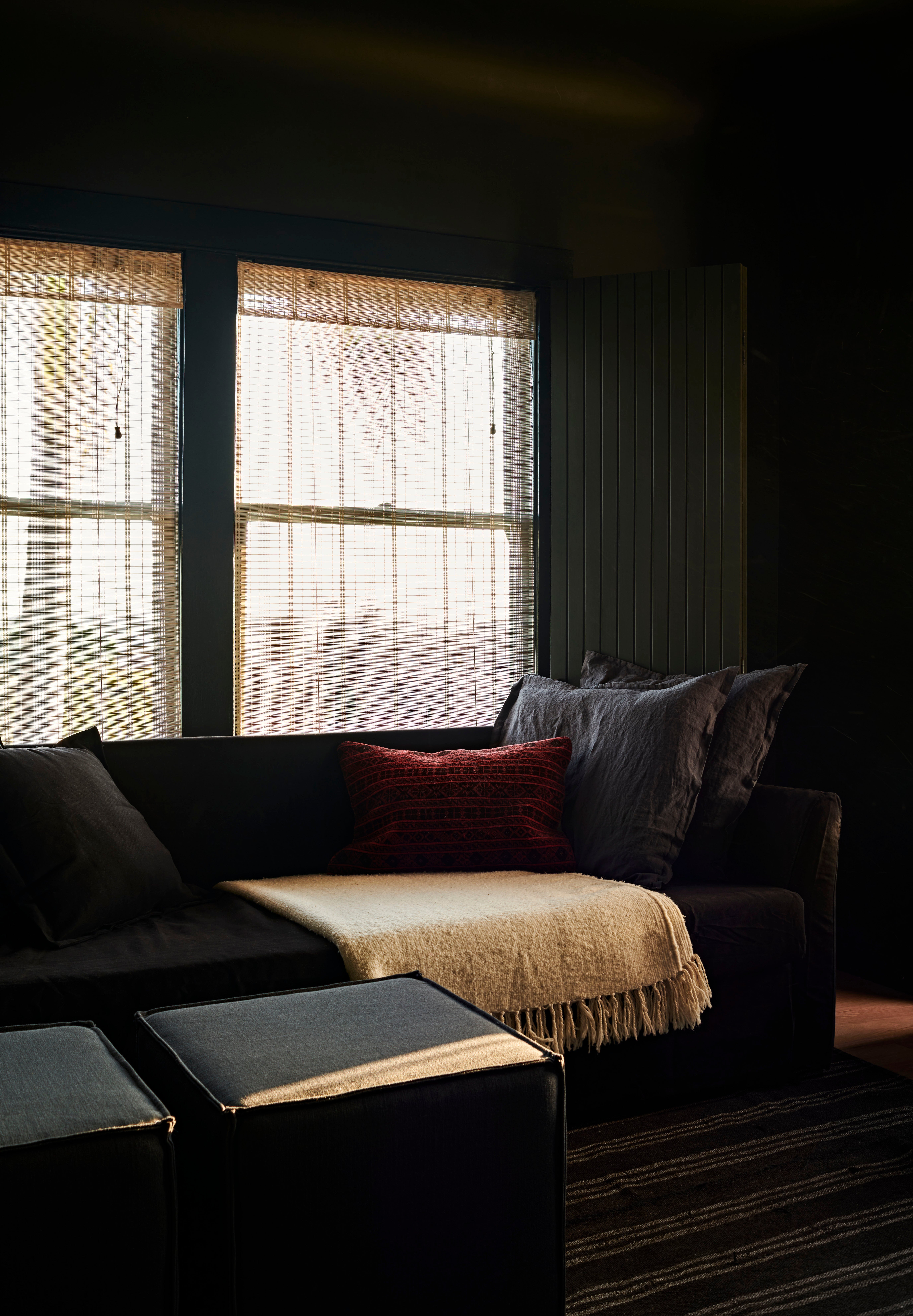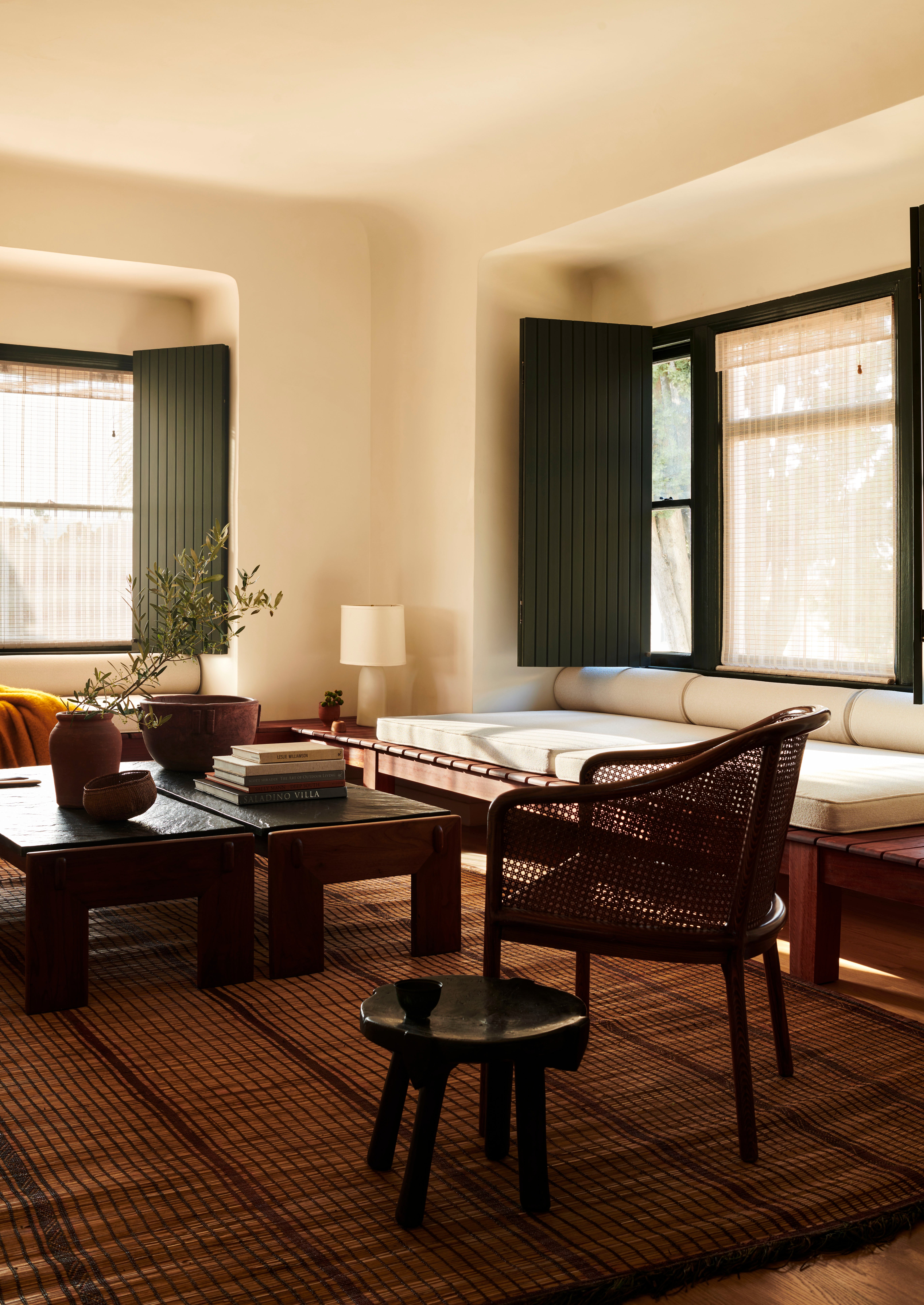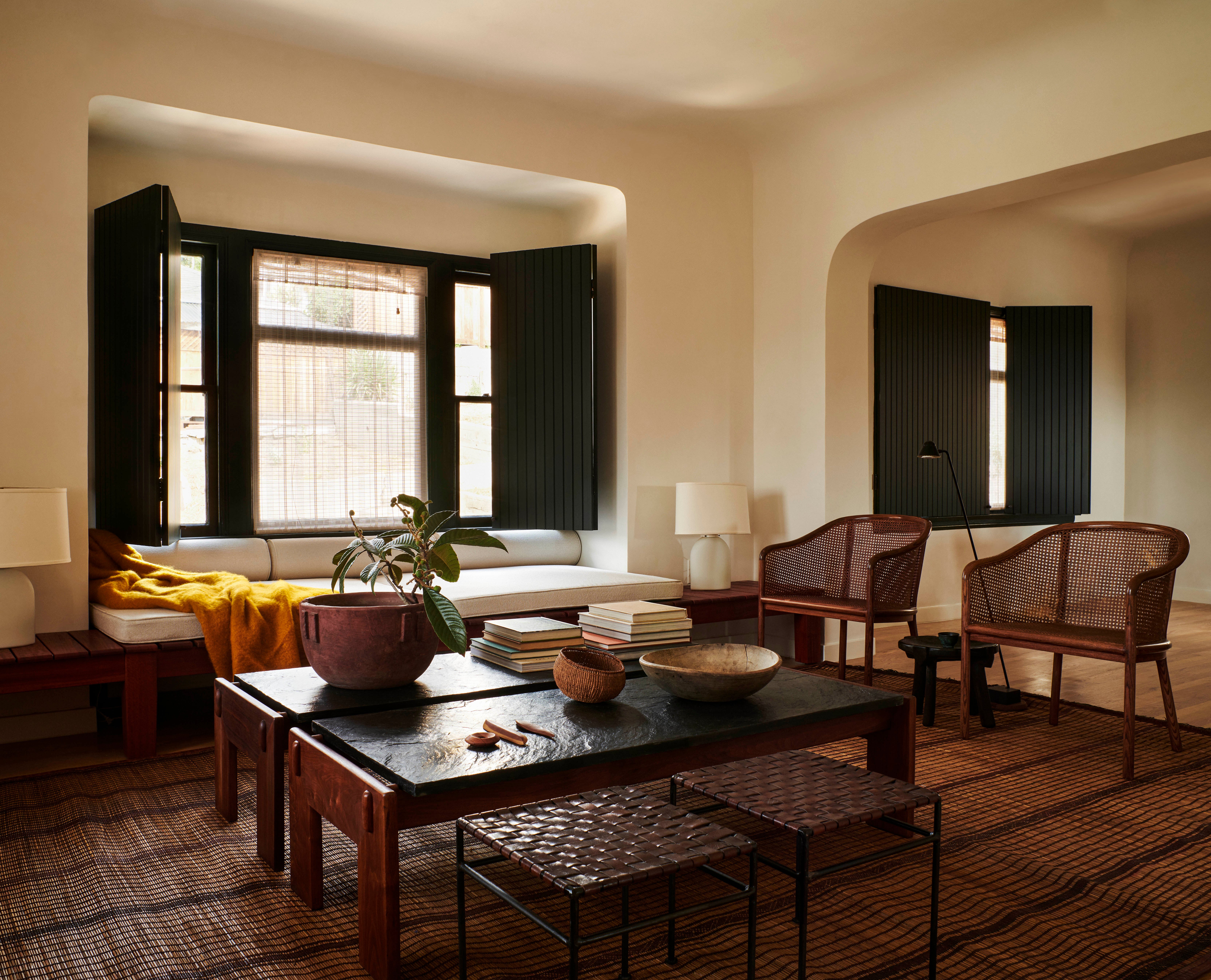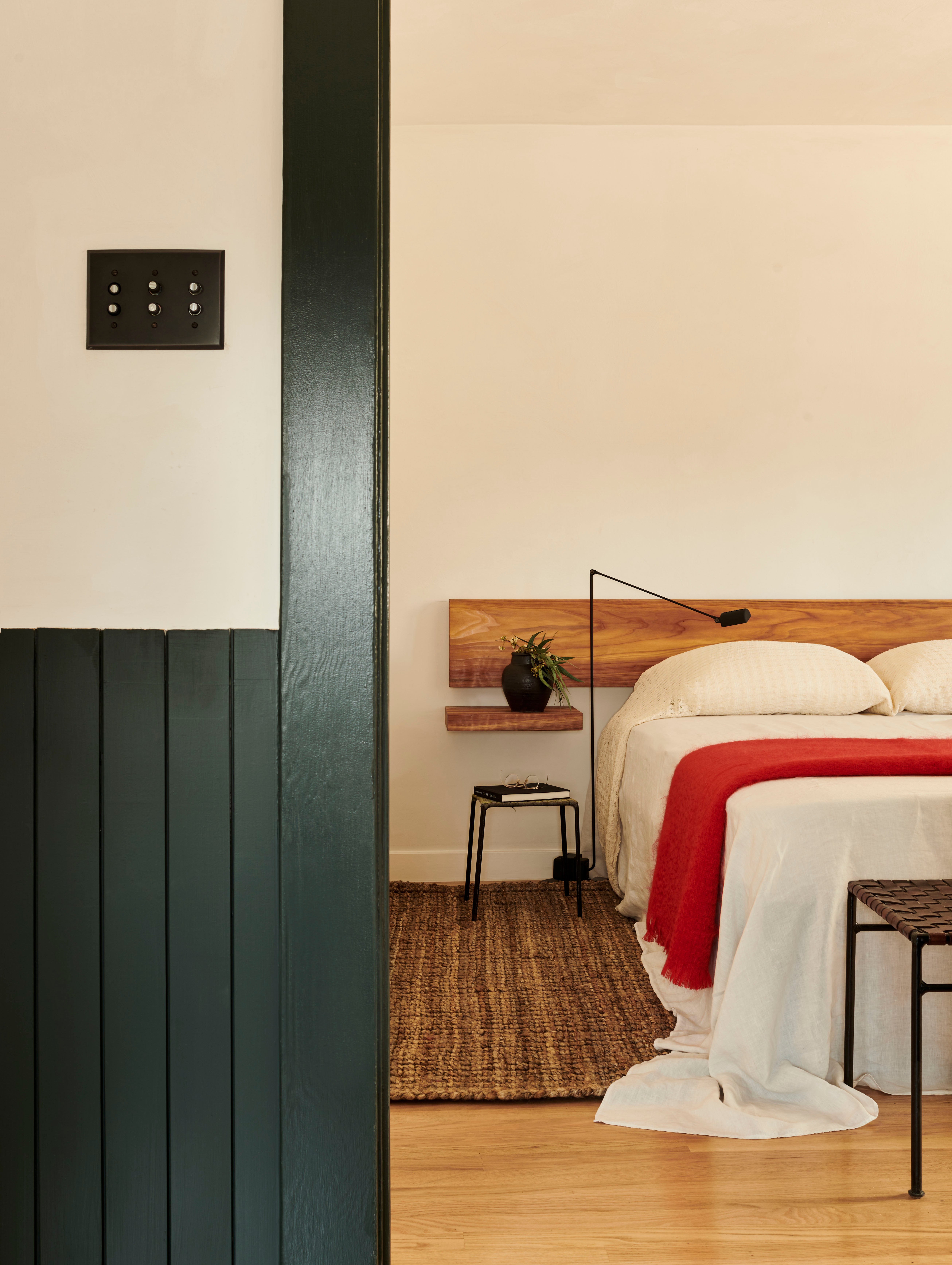 Primary dressed in neutrals, the living room is lined by moody, green-toned shutters and is anchored by an oiled, red Gum Eucalyptus built in sofa made especially for the space. Tying the spaces together, the adjacent office utilizes the same dark green shutters. An antique Mexican desk, copper Lindsay Adelman table lamp, and repurposed Greta Grossman chair flank the westward view of the downtown skyline. The bedroom features vaulted, lime-washed walls and ceilings and a custom redwood headboard and furniture.