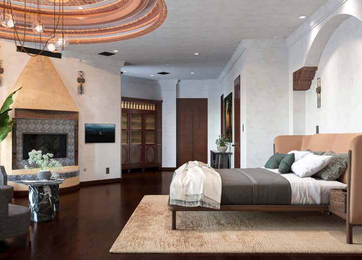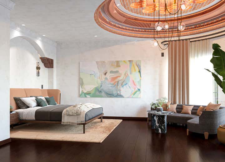 The primary bedroom features a dusty pink color palette in the upholstered headboard, rug, sofa cushions, and drapes. A dramatic pendant chandelier made from hand-blown textured glass and brass hangs in this recess. The expansive wrap-around upholstered headboard is balanced by the exposed timber bed frame made from Danish oiled walnut.