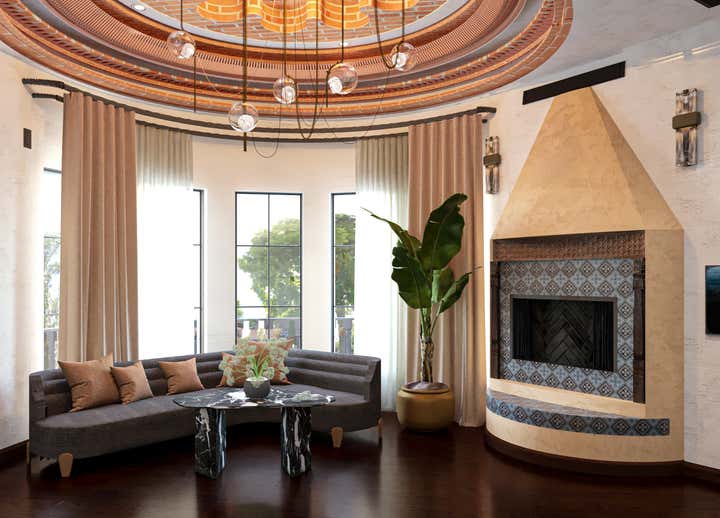 The black and white marble coffee table creates a dramatic focal point. These darker tones, alongside the grey textile of the custom curved sofa, create a point of contrast that grounds the dusty pink highlights around the room.