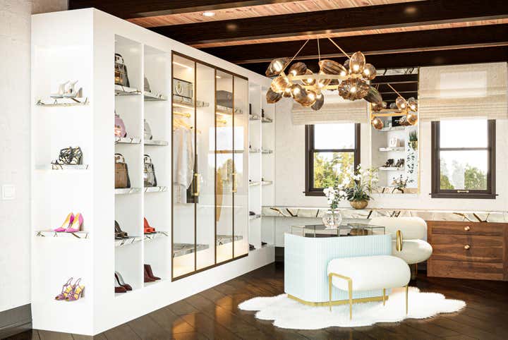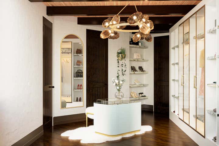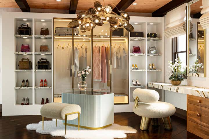 The dressing room features a custom built-in vanity, closet, and shelving, with glass doors flanked on either side by multiple shelves that create a retail-like environment. The shelving and vanity countertop is made from a beautiful slab of Quartzite, which harmonizes with the tone of the custom-built island in the center of the room. Bronze accents carry throughout the space in the vanity chair's cast legs, the drawer hardware's bronze patina, and the hand-cast satin bronze legs of the vanity bench. The vanity chair is upholstered in Boucle. These seating options are tied together with a plush, faux sheepskin area rug whose thick pile and organic shape bring warmth and softness to the floor.