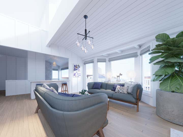 In the living room, material elements and colors from the entryway are reflected in the the deep blue Vegan-friendly upholstery and Danish oiled walnut of the sofa. The fine artisanal quality of the exposed wood frame gives the sofa lightness and elegance. At the same time, their shape and placement create an enclosed and intimate environment perfect for relaxation or small social gatherings. The artwork incorporates natural imagery such as water birds and ocean scapes. These elements carry through in the coffee table made from reclaimed hardwood, which features plant life embossed into the concrete surface of the tabletop, all underneath rain drop shaped pendant lighting.