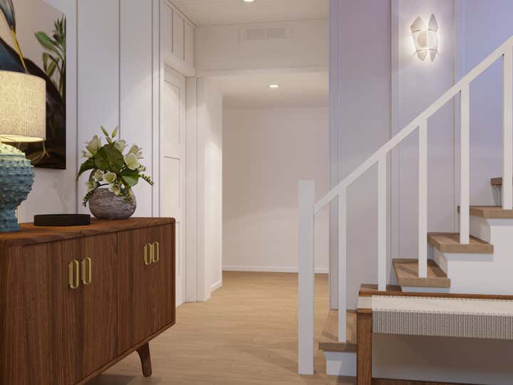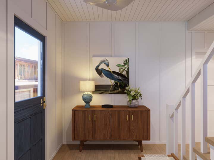 The entryway features a deep blue dutch door reflecting the color of the sea and a glass window that floods the space with natural light. These blue tones carry through the room in imagery and forms from the natural world, such as the painting of a Blue Heron installed above the sideboard. This room features a collection of contemporary ceramic objects, such as the stylized flush mount ceiling light and the ceramic lamp that resembles the form of a sea urchin. These objects are grounded by the vintage ceramic bowl and planter containing flowers. The sideboard, made from Danish oiled walnut, offers tidy storage options, while the tone of its wood finish harmonizes with the soothing blue of the room to create a welcoming entrance.