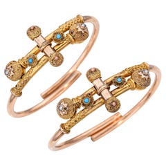 Pair of 14K Victorian Taille d'Epargne Enamel Bangle Cuffs from the 1870's. Lovely matching pair with ornate black enamel designs of elegant fruit baskets and Victorian tracery on bo...