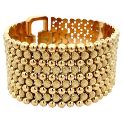 We are loving this extravagant vintage beauty!! Bracelet Details Material: 14K Yellow Gold Era: Retro 1960 - 1980 Finish: Brushed Top Width: 25mm Bottom Width: 17.5mm Weight: 40.1 G...