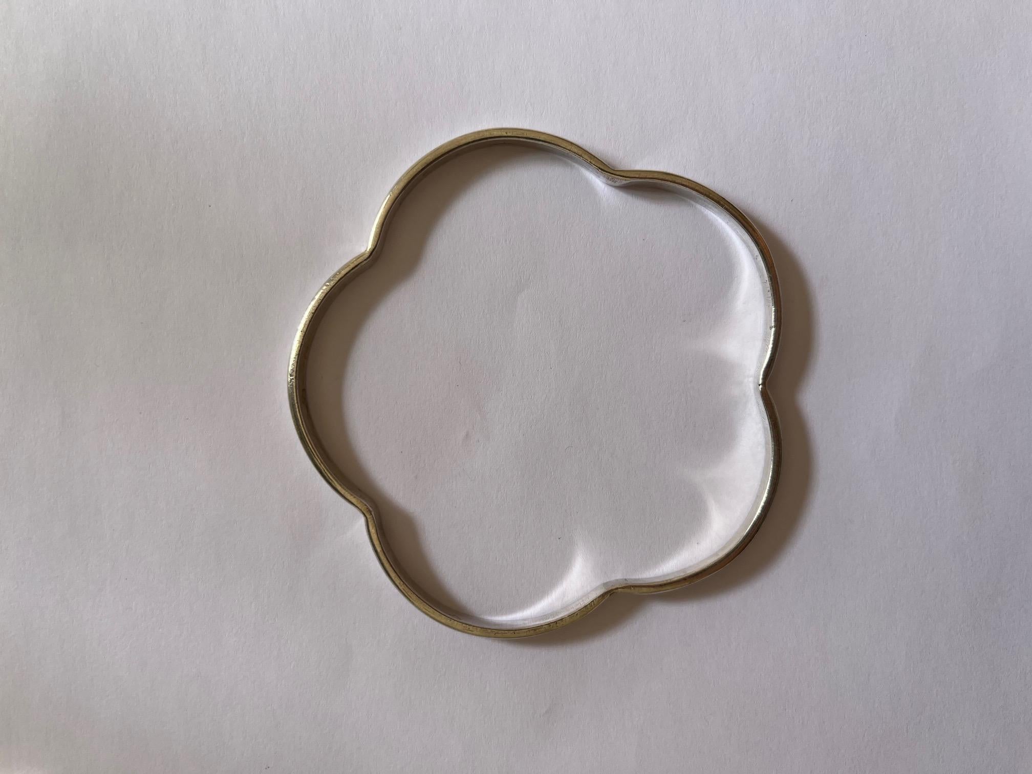 This set is composed of four flower-shaped bangles. The four bangles are silver-toned. The design is delicate with the slimness of the four bracelets. No hallmarks appear on any of the bangles.