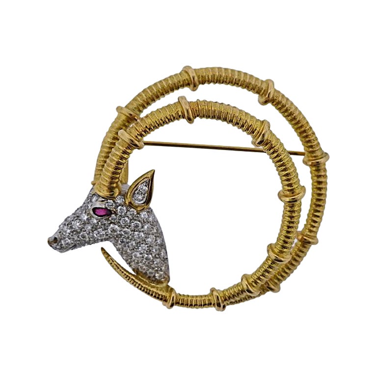 - By Tiffany & Co.Located in Chicago, ILCirca 1990 Tiffany & company 18k yellow Gold Duck brooch, centrally set with a Chrysoprase and a Ruby Eye, measu...Category