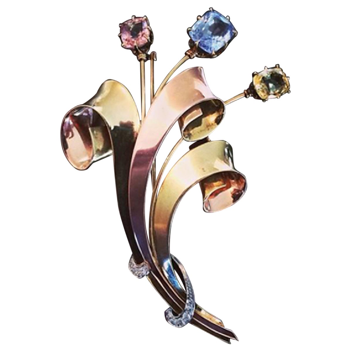 - By Tiffany & Co.Located in Chicago, ILCirca 1940 Tiffany & Company 14K Rose and Green Gold flowers form Brooch in a very Retro Period style, measuring...Category