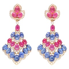 Ruby And Blue Sapphire Oval Cabochons Baroque Pearls 14K Gold Diamonds Earrings