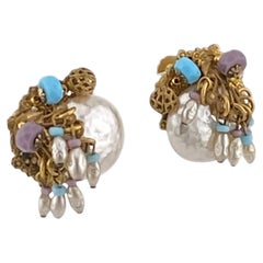 Vintage gold tone faux pearls rhinestones designer clip on earrings