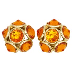 Vintage gold tone citrine rhinestones flower designer clip on earrings