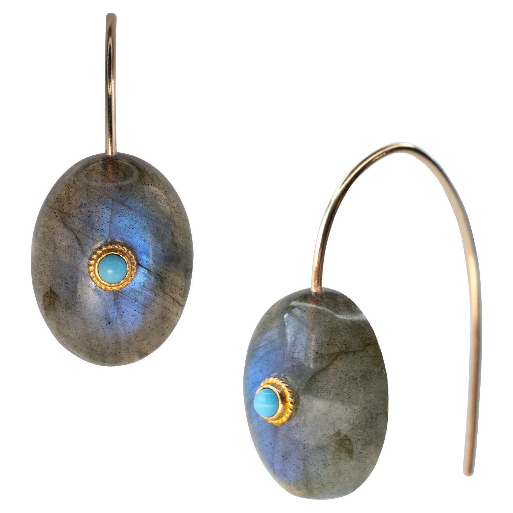 A STUNNING PAIR OF FACETED LABRADORITE DROP DANGLE PENDANT EARRINGS OF 2 1/8 INCHES IN LENGTH WITH DIAMOND ACCENTS AT THE TOP. THE LABRADORITE IS SET IN 10 KARAT GOLD. THE DIAMOND SET HOOKS ARE STERLING SILVER WITH A GOLD WASH. THE EARRINGS ARE OF GREAT STYLE WITH SUCH DELIGHTFUL SPIRITUALITY, ROMANCE AND GLAMOR.