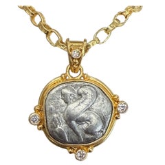 A rare and authentic silver "tetradrachm" coin from Seleukos I Nikator 312-281 BC depicts Athena driving a "quadriga" (a chariot) pulled by 4 horned elephants. Seleucus was a Macedonian Greek general who was one of the successors of Alexander the Great. In the power struggles that followed Alexander's death, he became ruler of Asia Minor, Syria, Mesopotamia, and the Iranian Plateau, eventually assuming the title of basileus (king). The state he established on these territories, the Seleucid Empire, was one of the major powers of the Hellenistic world, until being overcome by the Roman Republic and Parthian Empire in the late second and early first centuries BC. In 306 BC Seleucus attempted to invade India, and in the subsequent settlement with the Mauryan Emperor Chandragupta, he obtained 500 war elephants which were later used in campaigns in the west. Although no "quadrigas" were ever actually pulled by 4 elephants, Seleukos chose to use this image on his coinage. The opposite side of the coin features Zeus, king of the gods. This is an extremely rare coin not usually seen in jewelry. It is set in a signature handmade Steven Battelle 22K gold hammered...