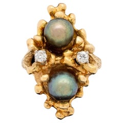 14k Yellow Gold .03 Carat Diamond & Pearl Modernist/Brutalist Ring Size 6.25