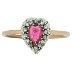 Old Halo Ring from ca. late 19th early 20th cent. with Red Ruby 5 mm x 4 mm/ ca. 0.45ct and 10 old diamond cut Ø 1.5 mm / 0.015 ct each = Rock Crystal / White Quartz, White Spine...