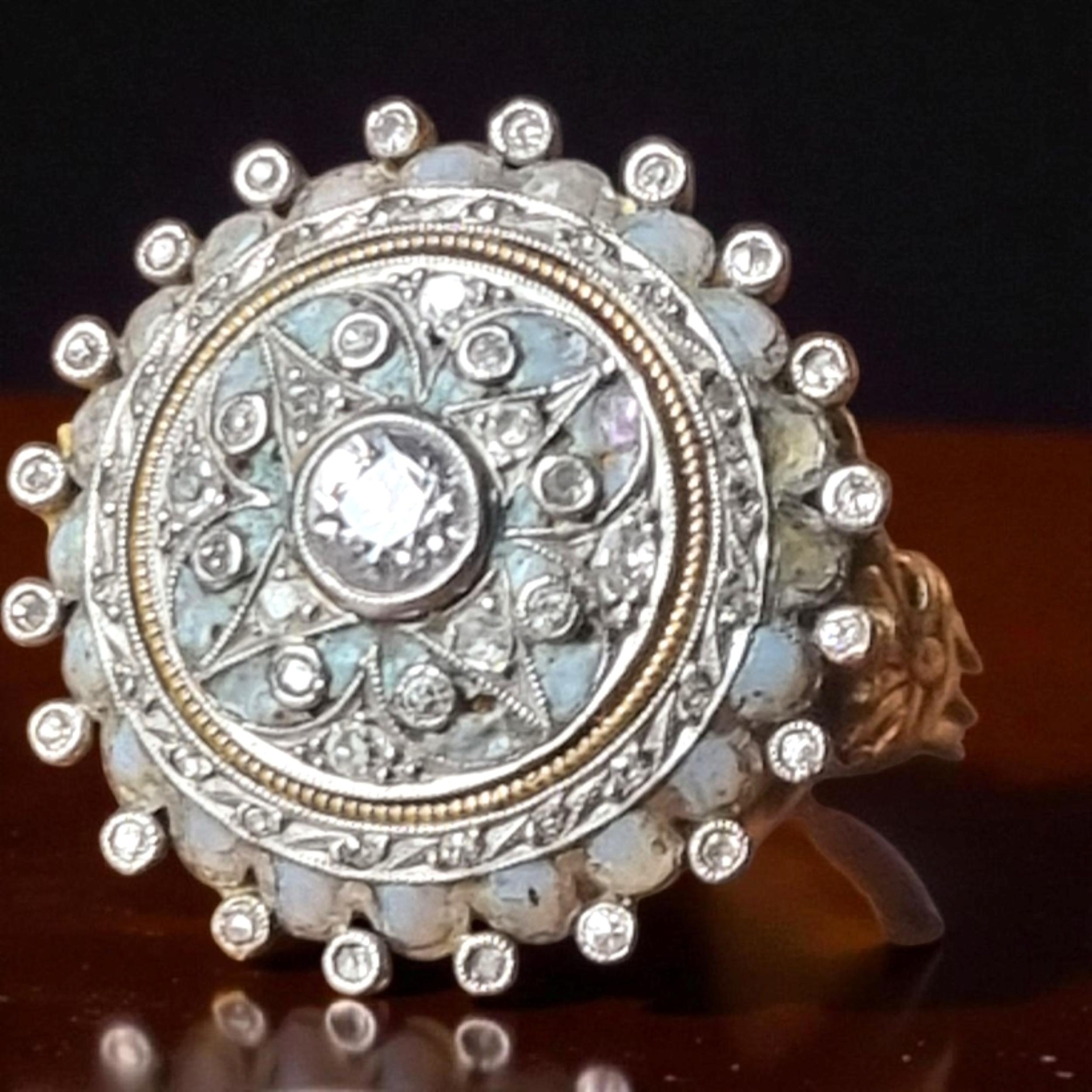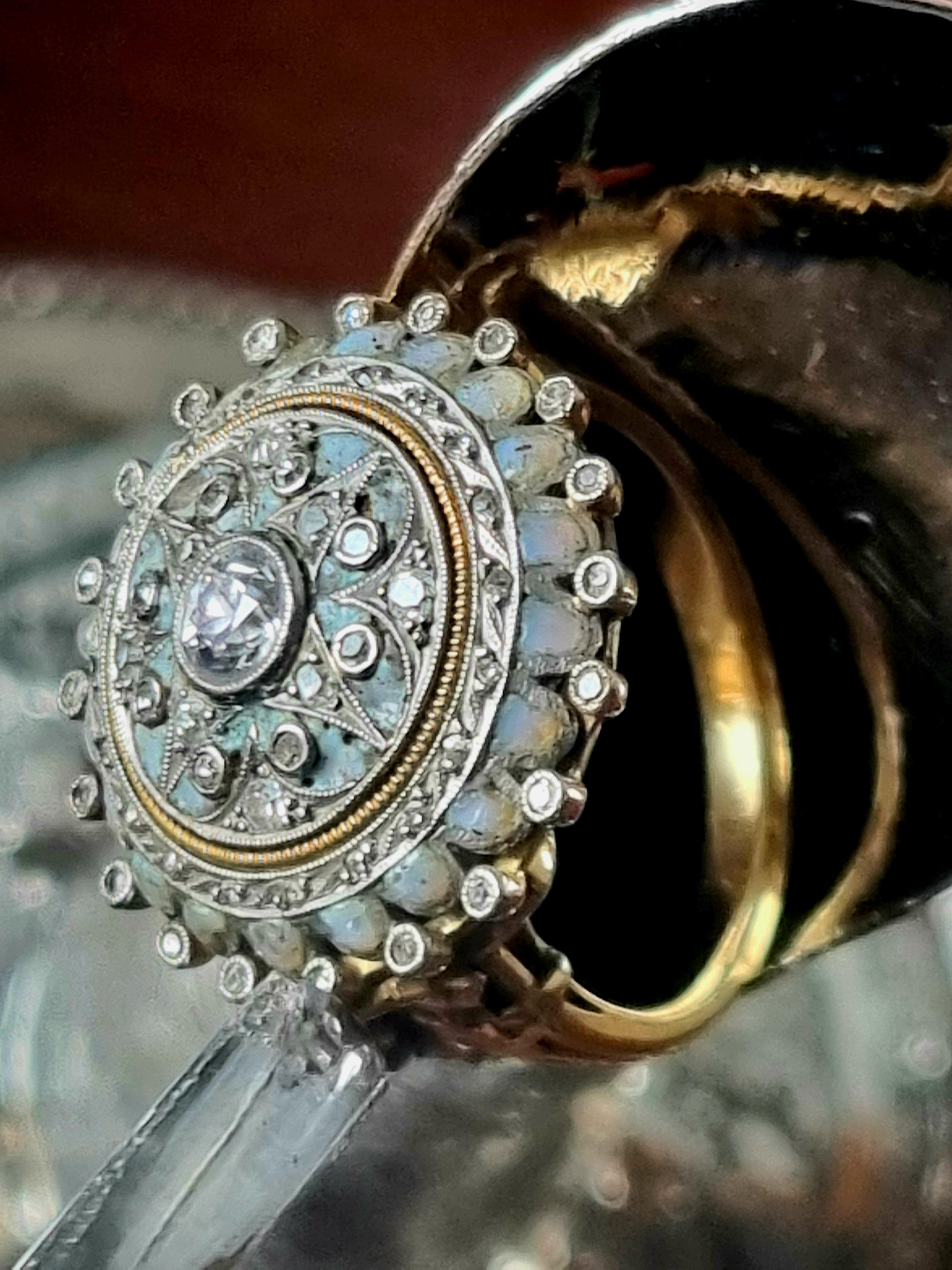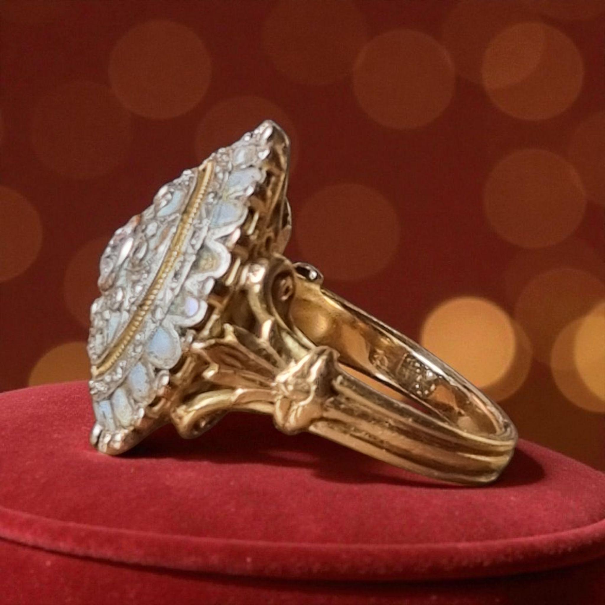 c.1900 Art Nouveau Antique Ring – Old Mine Cut Diamonds & Opals 18K Yellow Gold