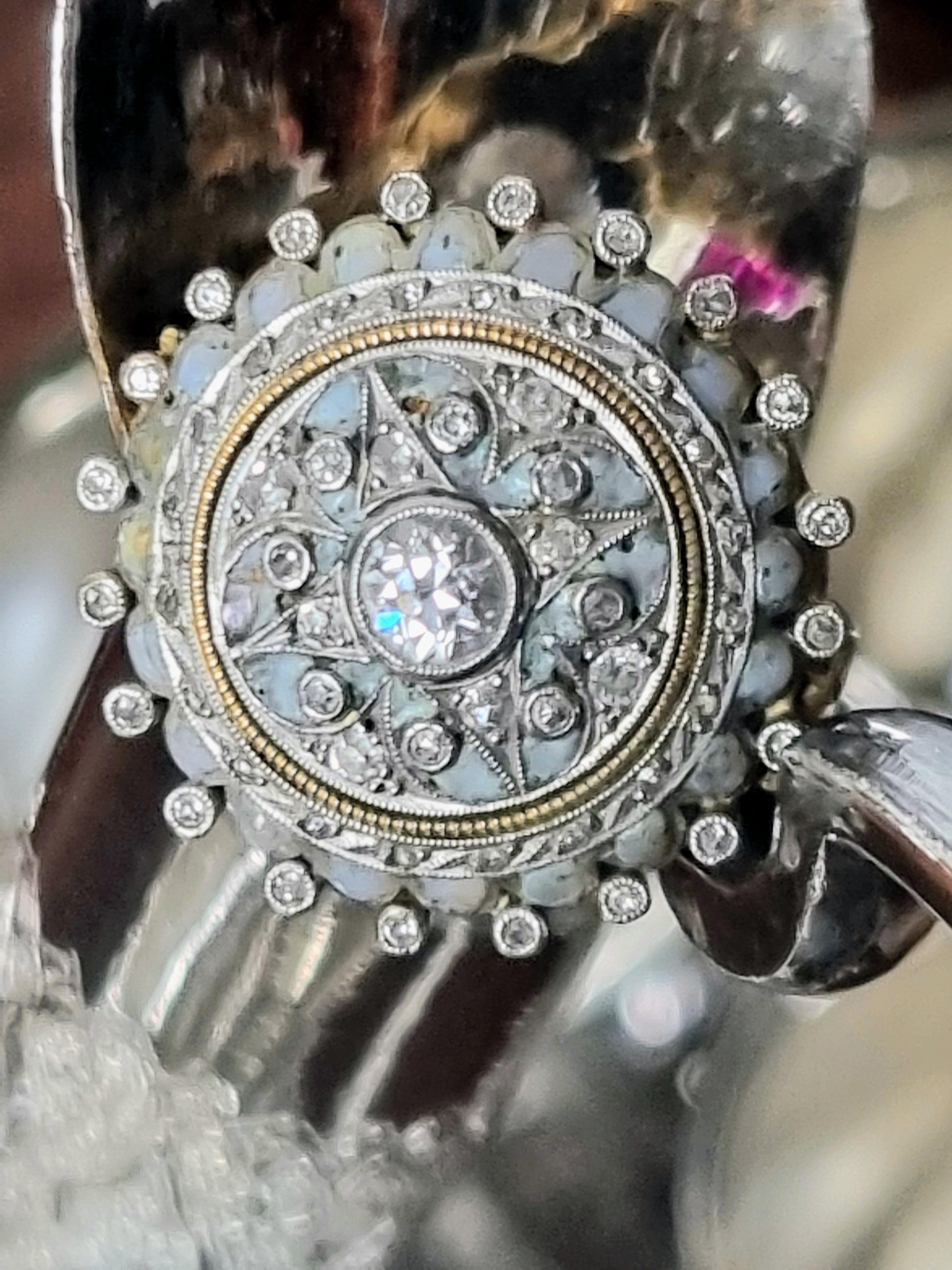 At its center lies an old European-cut diamond of approximately 0.35 carats, encircled by a halo of smaller old-cut diamonds set in platinum with delicate milgrain detailing. Surrounding these is an outer ring of luminous natural opals, their pastel play-of-color echoing the soft iridescence beloved by Art Nouveau artisans.