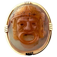 The conical-shaped agate gemstone displays various bands of colour ranging from honey brown to greyish-blue. The engraving depicts the bust of a man wearing a helmet, possibly winged which would depict Mercury, the Roman god of commerce, financial gain and communication. In Roman times, people would wear rings with the intaglio of Mercury in hope that the he would protect them and bless them with good financial fortune in their lives.