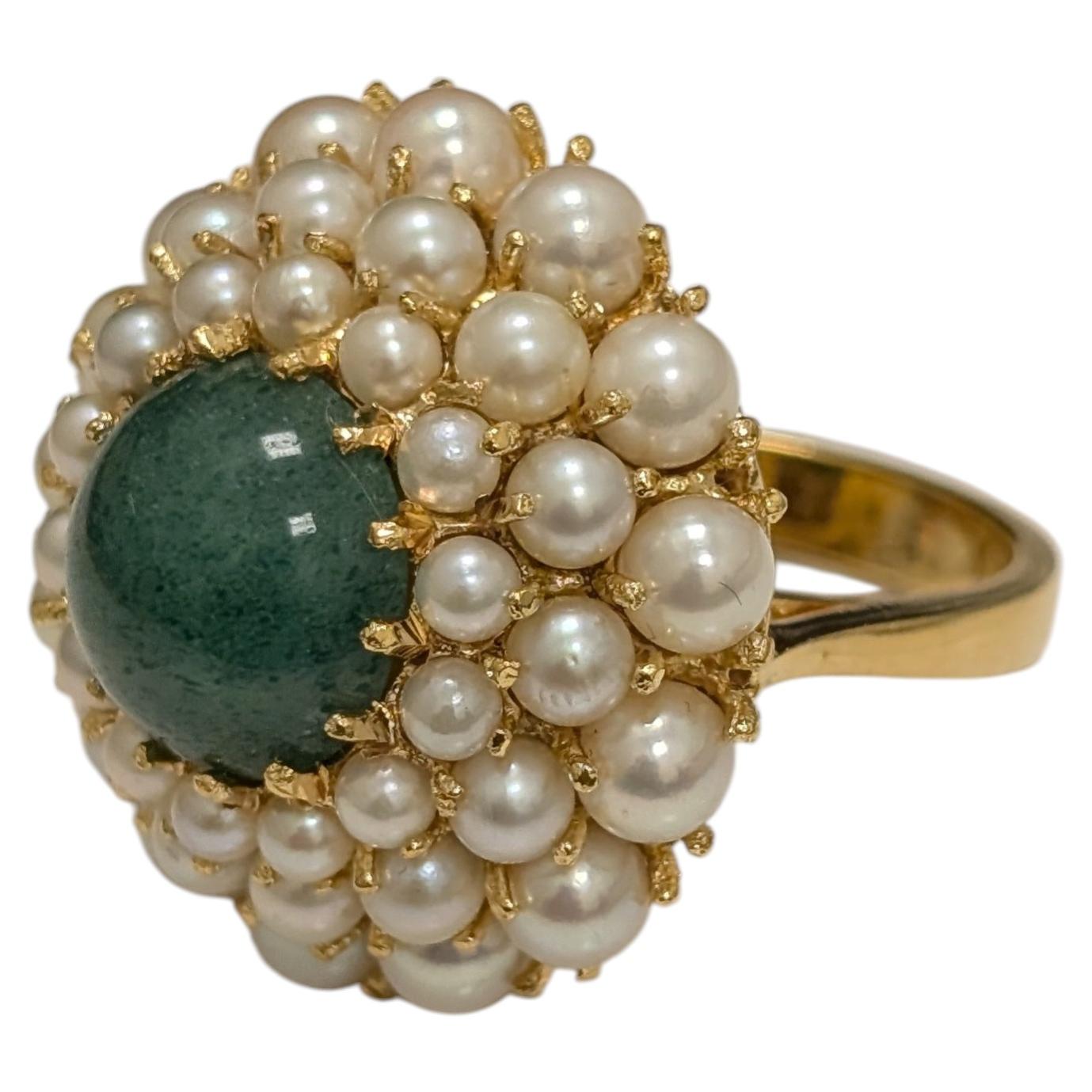 Forty round brilliant diamonds, approximately 0.33 carats total with H color and VS2 clarity, frame the center stone in a refined, sparkling border that enhances its luminous play-of-color. The modern geometric silhouette paired with rich yellow gold highlights the ring’s sculptural, contemporary elegance.