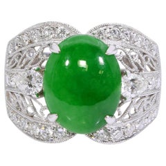 A true statement piece, this ring exudes both luxury and tradition, making it a meaningful addition to any fine jewelry collection. The "Moss in Snow" pattern is not just aesthetically stunning but also carries deep symbolic meaning in Asian culture, representing the persistence of life and hope even in challenging times. The oval cabochon cut enhances the stone's natural translucency while maximizing the visual impact of the floating green patches. This ring represents not only a beautiful piece of jewelry but also a piece of Chinese jewelry-making history, dating from a significant period when traditional craftsmanship met modern styling. Whether worn as a personal talisman or gifted to a loved one, this vintage Burmese jadeite ring...