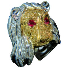 Our artisans have poured their expertise and dedication into every facet of this remarkable ring. Meticulously selected multi-colored diamonds, including 1.99 carats brilliant blues, 1.99 carats vivid browns, and 1.09 carats vibrant yellows, and 0.31 carats of shimmering whites are expertly set to create a harmonious dance of colors that mirror the grace and energy of a galloping horse. The 18k gold and palladium band, chosen for its exceptional durability and lustrous finish, complements the gemstones perfectly. Black Spinel 3.53 carats sculpt the ears and nose of our beauty.
