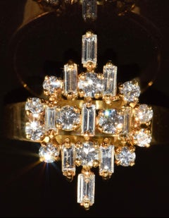 Monture Cartier diamond cocktail ring. Centrally set with a round old cut diamond in an open back claw setting with an approximate weight of 1.30 carats, flanked by sixteen round eight-cut diamonds in open back grain settings with a combined weight of 0.24 carats, and further set with eight round transitional cut diamonds in open back grain settings with a combined weight of 0.26 carats. The total approximate diamond weight is 1.80 carats, to an impressive architectural design, featuring polished edges, a raised gallery with ridged detail throughout, and fancy open backholing, leading to broad integrated shoulders which flow through to a ridged D-shaped shank. Marked 18 carat yellow gold and platinum, French import marks, indistinct makers mark, signed Monture Cartier', accompanied by original Cartier box, French, 1950, accompanied by IAJA report #XP2251-040325.