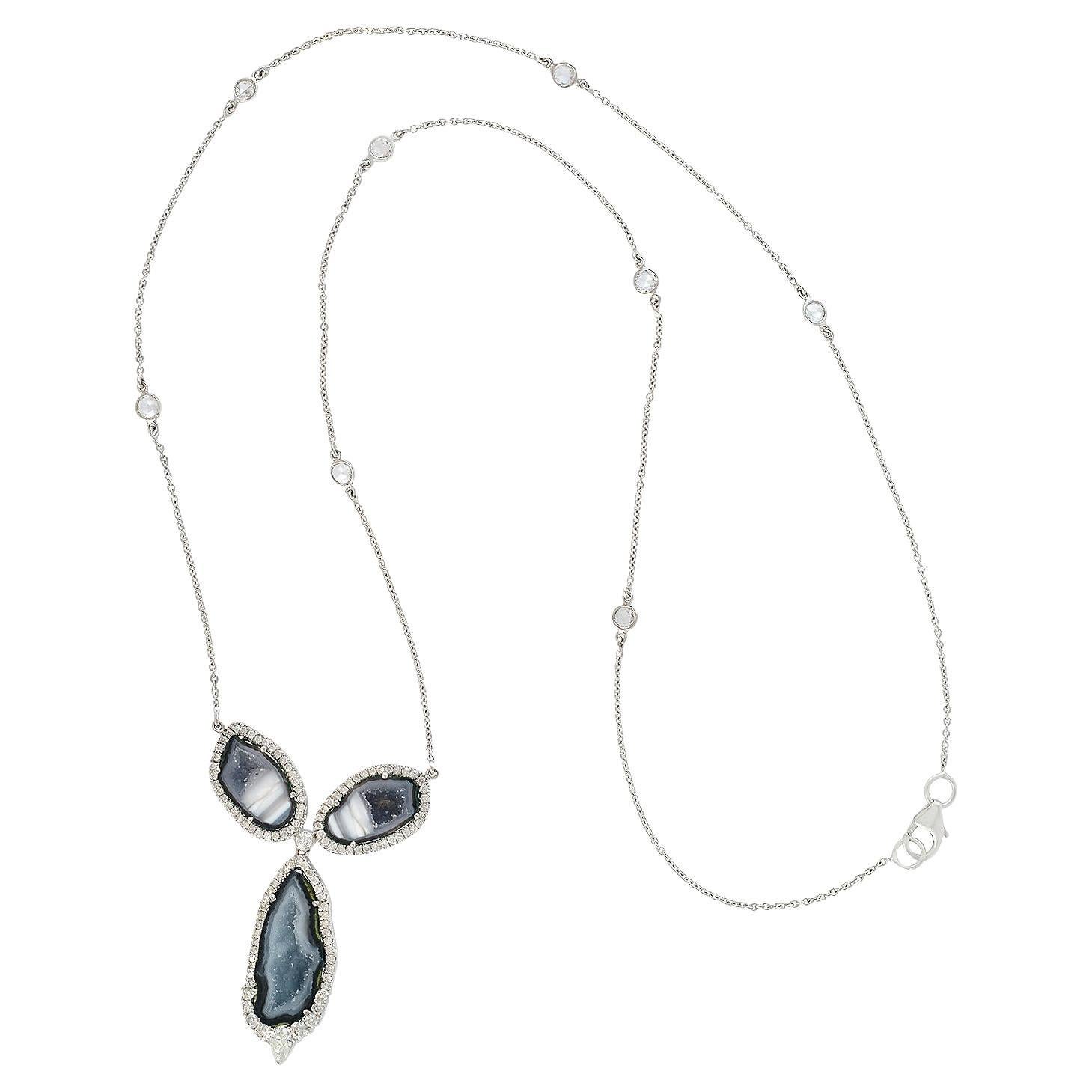 The necklace is fastened with a rare, unique sterling silver clasp with natural druzy agate cabochon.