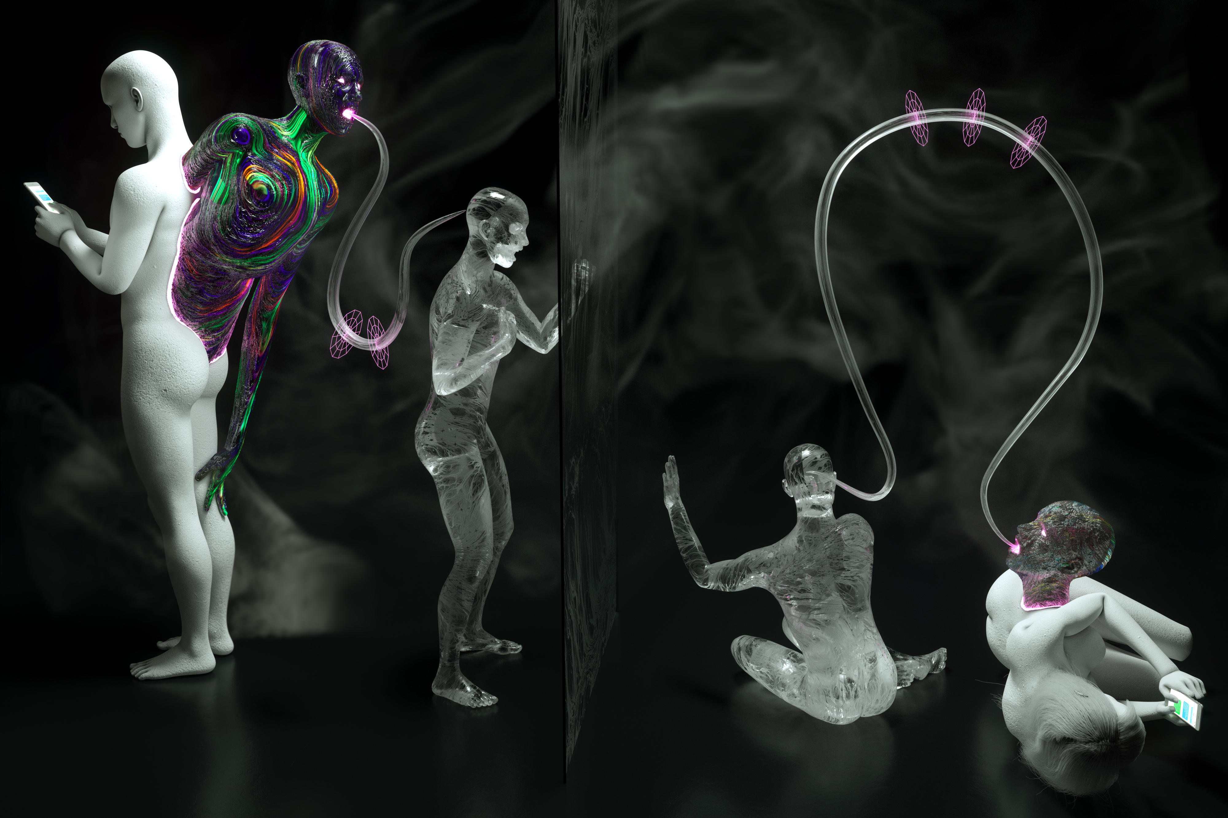 Yebu-Tonu (yebutonu) is a 3D artist from Toronto, Canada currently living in Berlin. Originally starting his career-path in neuroscience, he researched rodent psychopharmacology and human brain mapping. After withdrawing from graduate school, his academic experiences became the pulsion toward new horizons, asking questions that cut across technical art and the subject.Self-taught with only a professional background in the sciences, Yebu-Tonu began experimenting with a variety of digital art methods until he found his calling in 3D. Inspired by certain themes in psychoanalysis, Yebu-Tonu became interested in the "conversation" between figures compositionally to "tell" a story or drama. Today, his work experimentally interrogates with volatile bodies, fantasy, unconscious theatre, and points of impossibilities from a subjective position.