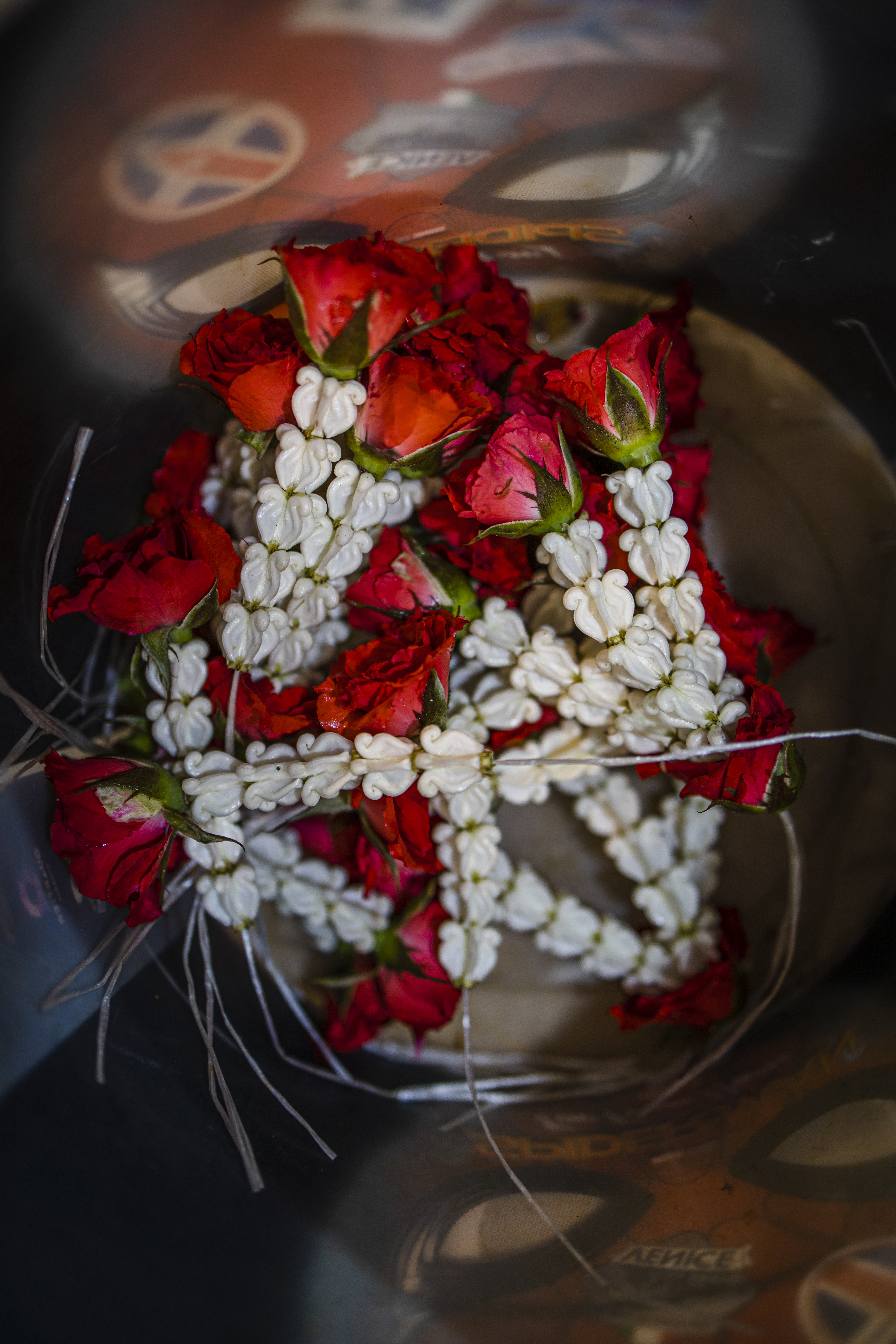 This photograph showcases the broad minded culture of buddhism; the traditional asian flowers, which are offered to the Buddha, are being prepared on a paper printed with the character of the Spiderman.