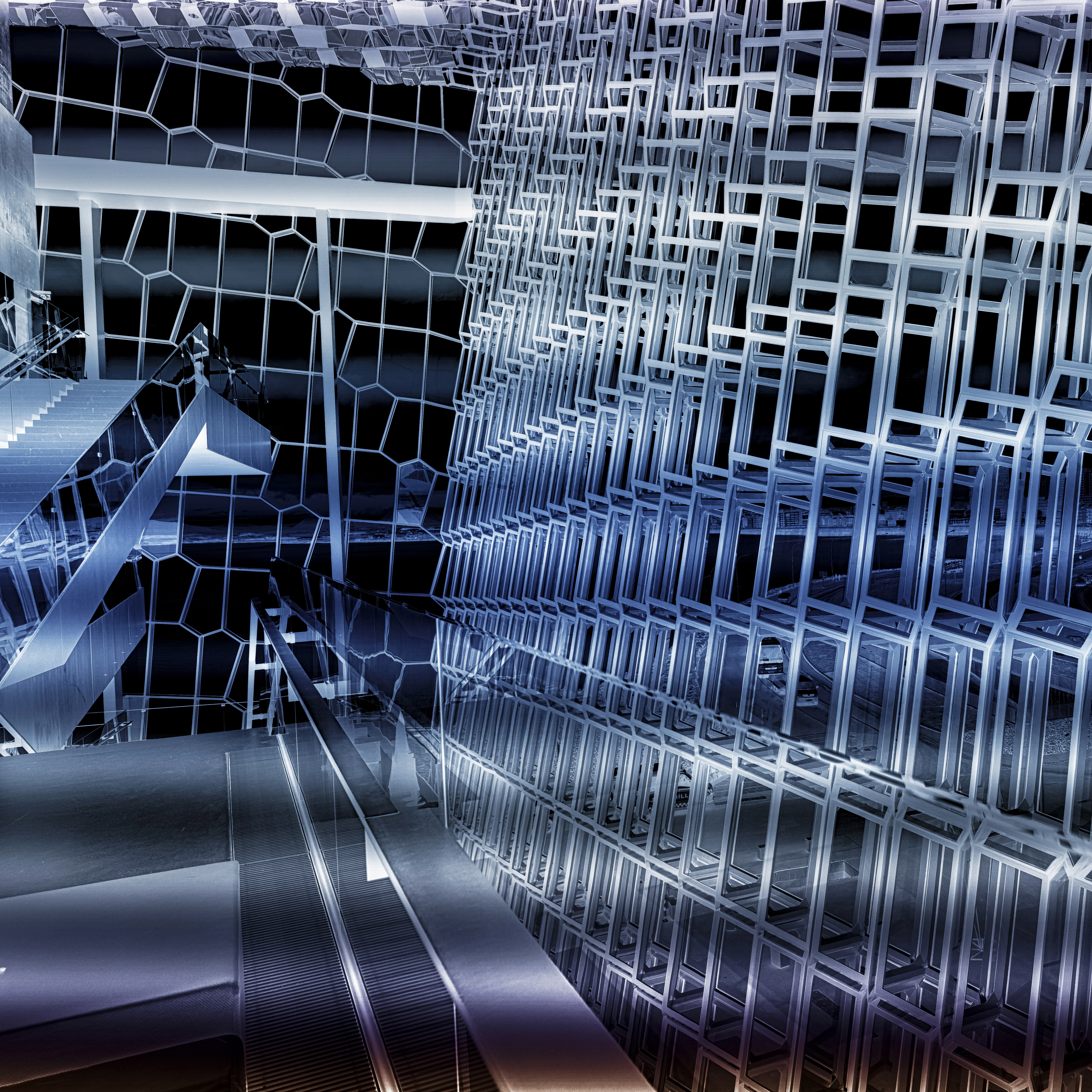 This artwork is a manipulated view from inside Harpa, the remarkable concert hall in Reykjavík, Iceland. Walking through Harpa is like wending your way through an etching by M.C. Escher. The scale, intriguing angles, and geodesic-like building materials delight the senses and create a unique architectural experience.