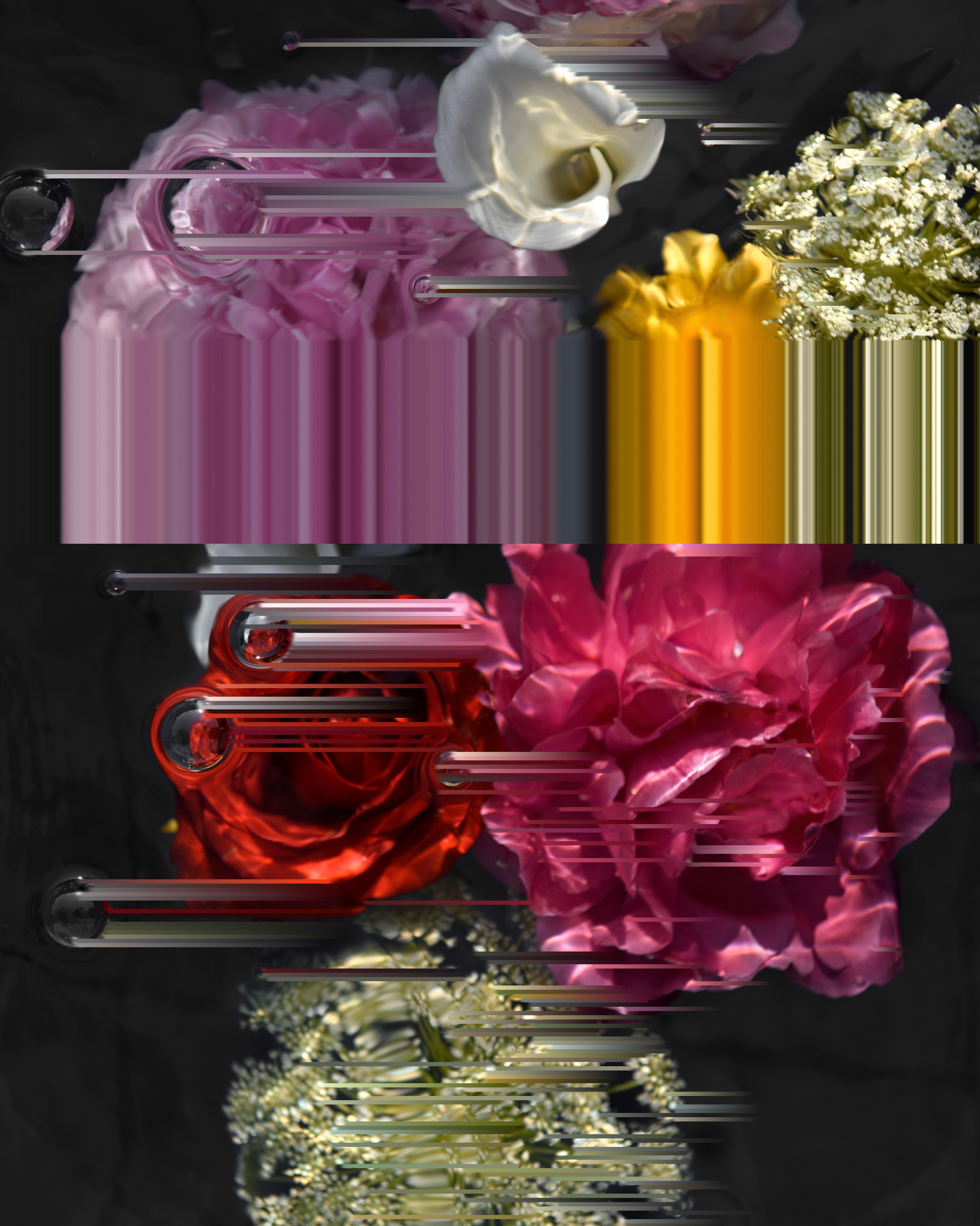 Nature Versus Nurture is an ongoing series of altered floral photographs that symbolically explore how we are a dynamic combination of inherent traits and products of our environment and experiences. This photograph of garden flowers submerged underwater was meticulously shot and retouched, then algorithmically glitched to create something new and unique.
