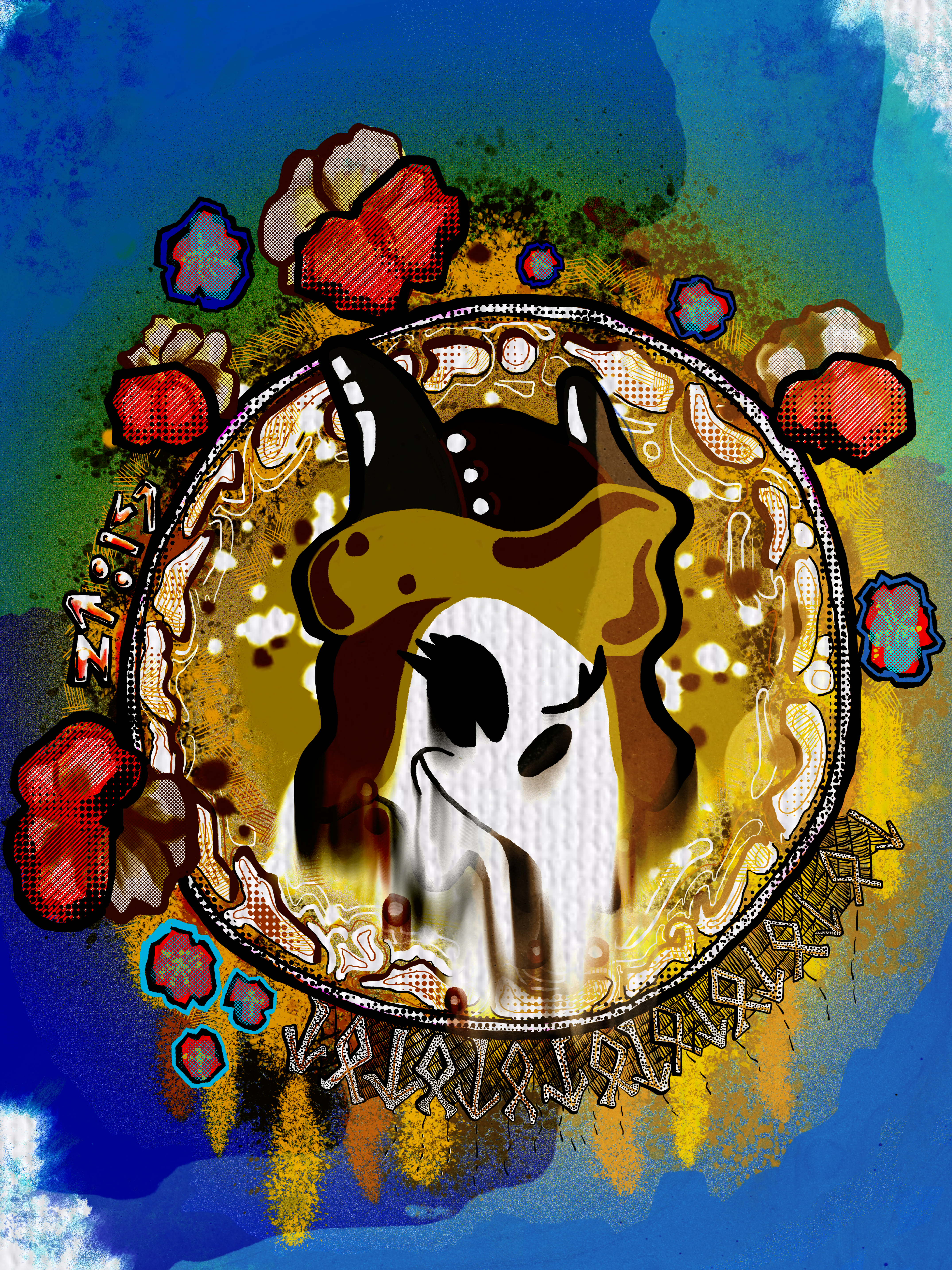 Runes are part of that discovery. I spent hours always after midnight creating this piece putting energy into a rune that specials out " A journey of prosperity and growth". But why be so serious within the meaning and showcase it as a fun retro piece and full of color and enlightenment. not only in its colors but your little iconic character fading away into your own little world.