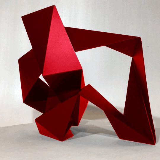 Bruno transforms the flat into spatial design. More important is the transition from one dimension to another and not so much the end result. He actually puts the flat shape (or parts of it) into motion, until it is what it should be. Due to the dynamics of the process, the movement in the design continues to exist and creates an unambiguous and non-static end product.
