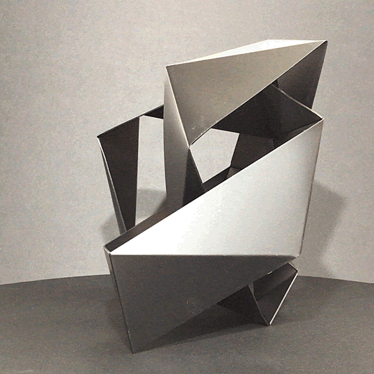 Bruno transforms the flat into spatial design. More important is the transition from one dimension to another and not so much the end result. He actually puts the flat shape (or parts of it) into motion, until it is what it should be. Due to the dynamics of the process, the movement in the design continues to exist and creates an unambiguous and non-static end product.