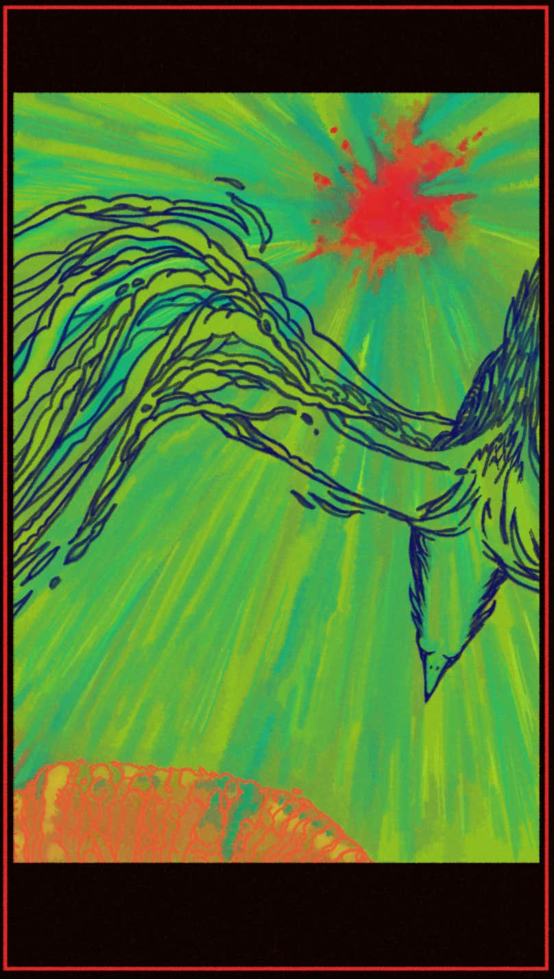 The work features three digital paintings inspired by the beginning of a lost poem. The first painting examines the idea of future in two animals inside a den, seemingly awakening by the red explosion's light. The second painting is the self, me, observing and reacting to the world. The third painting is the self dreaming the purest dream: to fly encompassing the physical constrains. 'Dolce avvenire! Questo ventre aperto, sono io.' 'Sweet future! This open belly, it's me.